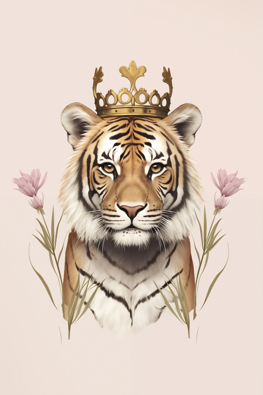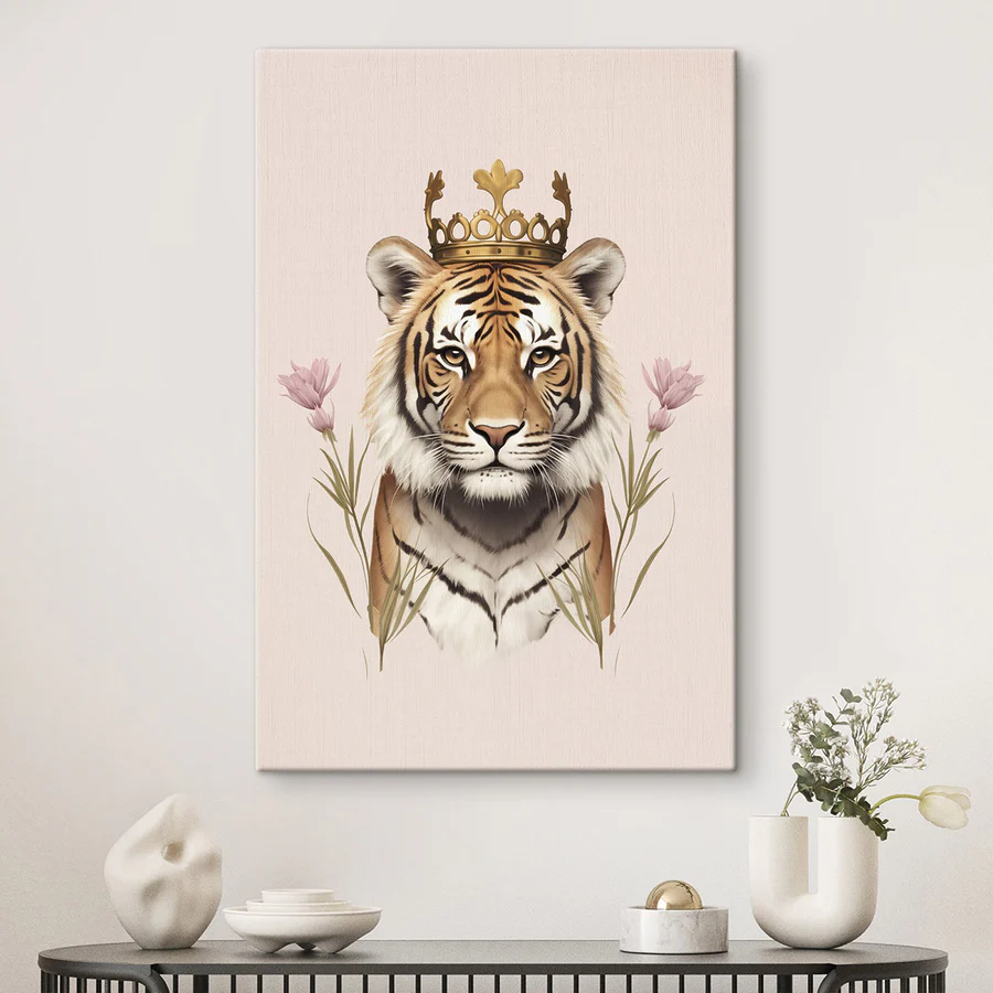 Meet the “Canvas Prints Tiger with a Crown.” This striking piece isn’t just a print—it’s a statement. Just imagine walking into a room and being greeted by the majestic gaze of a regal tiger, flowers blooming beside it. It’s like having a mini royal court right on your wall! This artwork adds a dash of wilderness to any space, making it ideal for those who appreciate nature’s beauty with a hint of whimsy. Friends might ask if it’s a king or just a well-dressed kitty, and that’s the charm! Perfect for brightening a living room or sparking a conversation, this piece will make anyone stop and appreciate—who knew art could be so fierce yet delicate?