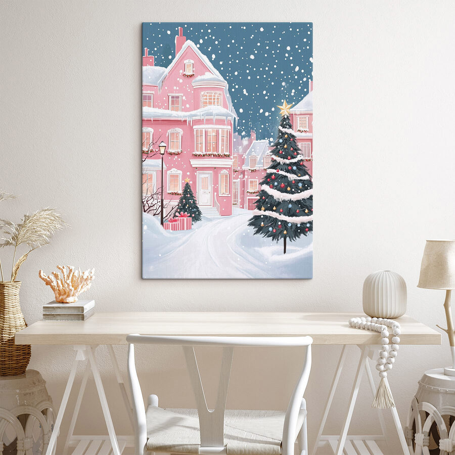 Stap binnen in een winterwonderland met deze charmante canvasprint! Stel je een gezellig roze huis voor, bedekt met zachte sneeuw, dat trots staat tegen een achtergrond van zachte sneeuwval. De levendige kerstboom schittert met kleurrijke versieringen en nodigt uit tot glimlachen en vrolijkheid. Elke blik op dit tafereel roept misschien wel jeugdherinneringen op aan de magie van de feestdagen, zoals de geur van versgebakken koekjes die door de lucht zweeft of het geluid van gelach met dierbaren om je heen. Perfect om elke kamer op te fleuren, het vangt de sfeer van het seizoen op een manier die vrienden zal doen zeggen: “Dat wil ik ook in mijn leven!” Voeg een vleugje vreugde toe aan je ruimte en laat de feestelijkheden beginnen!