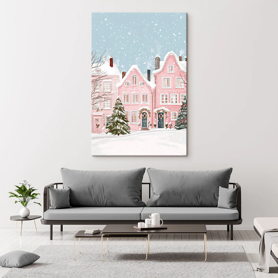 Transformeer elke muur met deze charmante canvasprint ‘Pink House with Snow’. Stel je voor: zachte sneeuwvlokken dwarrelen rond gezellige roze huisjes, glinsterend onder een lichtblauwe lucht. Het is alsof er een winterwonderland in je woonkamer is verschenen! Het dromerige tafereel vangt de magie van het seizoen en roept warme herinneringen op aan warme chocolademelk en gelach met vrienden. Of het nu een feestelijke achtergrond is voor de feestdagen of gewoon een heerlijke herinnering aan de schoonheid van de winter, deze print brengt een vrolijke, gezellige sfeer in elke ruimte. Hang hem op en laat de magie zich ontvouwen!
