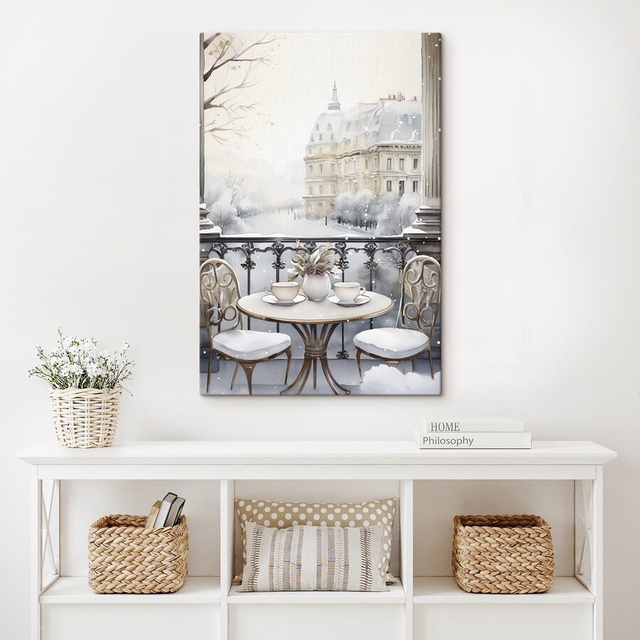 Transformeer uw ruimte met deze betoverende canvasprint, met een gezellige tafel met dampende kopjes en een charmante vaas met bloemen, allemaal tegen een dromerige besneeuwde achtergrond. Stel je eens voor: een rustige winterochtend, sneeuwvlokken dansen buiten terwijl je geniet van je favoriete drankje – deze print legt dat zalige moment perfect vast. De zachte kleuren en serene sfeer nodigen uit tot ontspanning, waardoor het perfect past in elke kamer. Of het nu in de woonkamer is of in een gezellig leeshoekje, dit kunstwerk voegt warmte en charme toe, als een vriendelijke knuffel op een koude dag. Het is niet alleen kunst, het is een ervaring!