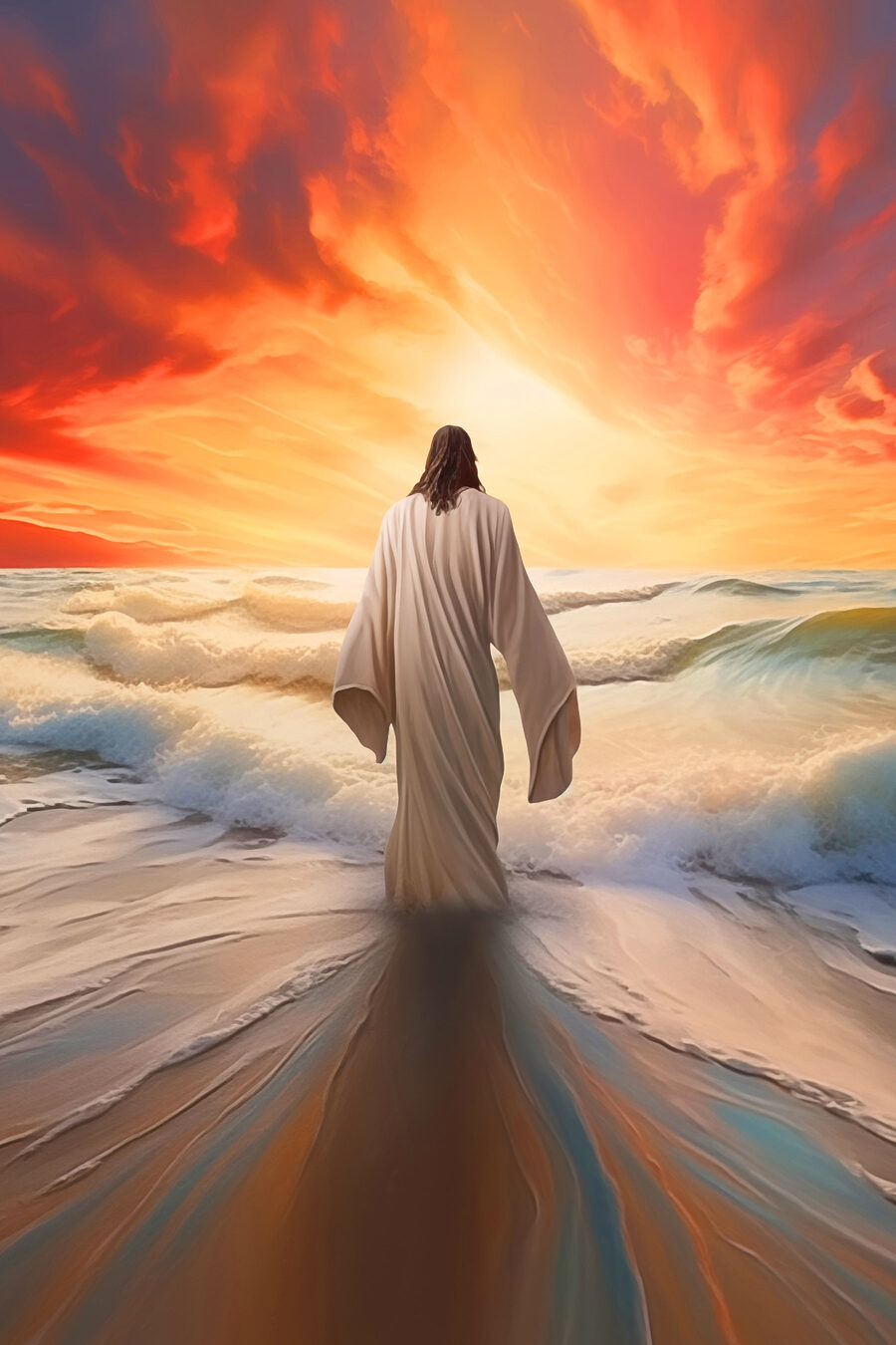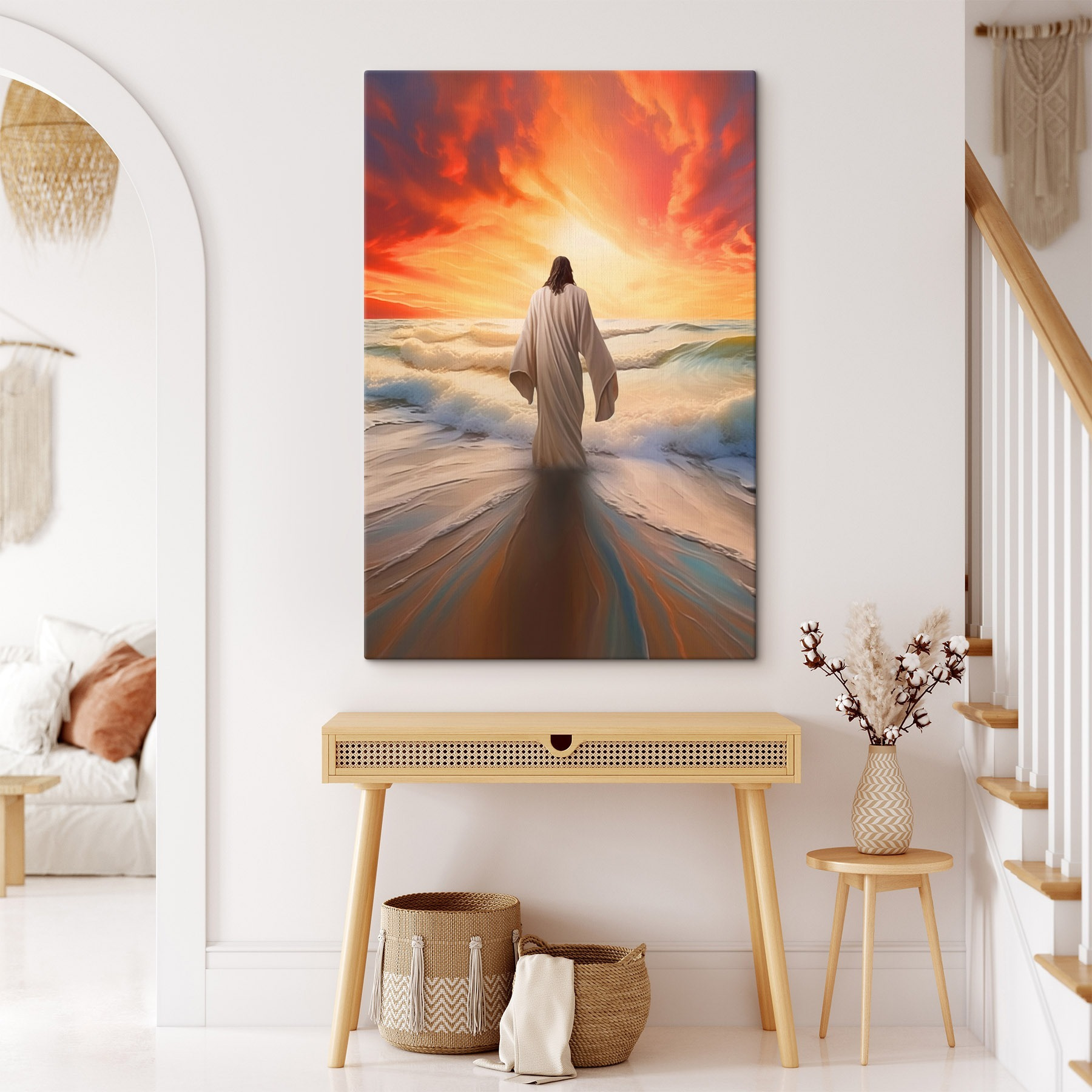 Stel je voor dat deze prachtige canvasprint in je woonkamer hangt en de sfeer direct verandert. Een figuur in een badjas die sereen in het water staat, omlijst door een dramatische zonsondergang, heeft iets fascinerends. Het voelt als een moment van vrede, een zachte herinnering om te ademen en de schoonheid van het leven te omarmen. Stel je vrienden voor die ernaar staren, verhalen uitwisselen of gewoon genieten van de kleuren – opvallende sinaasappels, zacht blauw, de glinstering van zachte golven. Dit stuk nodigt uit tot nadenken over de natuur, sereniteit en misschien zelfs een beetje soul-searching. Het is meer dan een decor; het is een gespreksstarter, een stukje rust in een drukke wereld – perfect voor elke natuurliefhebber of iedereen die behoefte heeft aan een dagelijkse herinnering aan sereniteit.