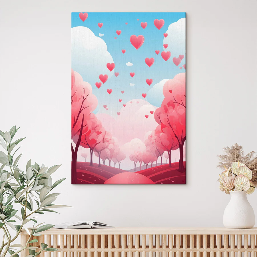 Step into a whimsical world with this “Canvas Prints Pink Trees with Hearts Flying in the Sky.” It’s like a fairytale come to life! Imagine pink trees swaying gently, with little hearts floating through a dreamy blue sky. It’s perfect for adding a splash of love to any wall.
