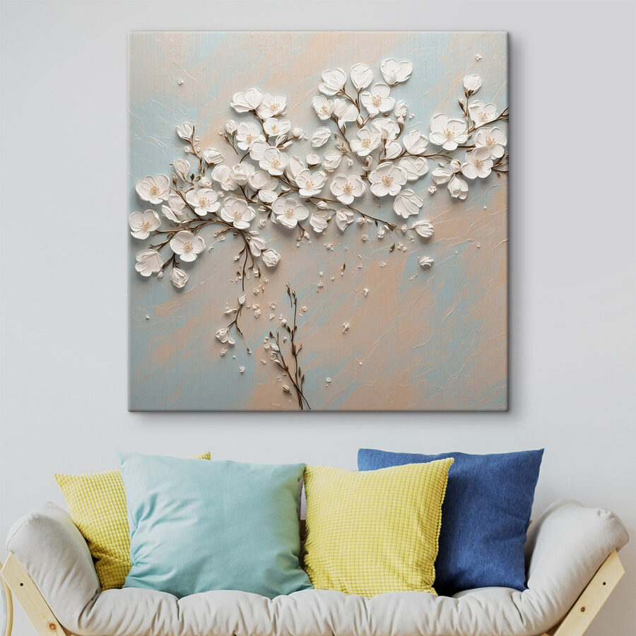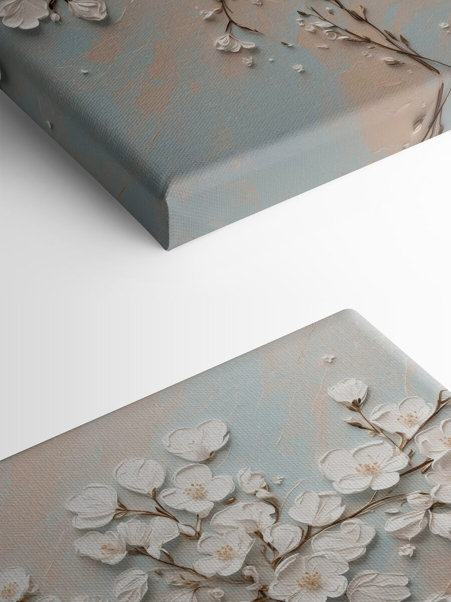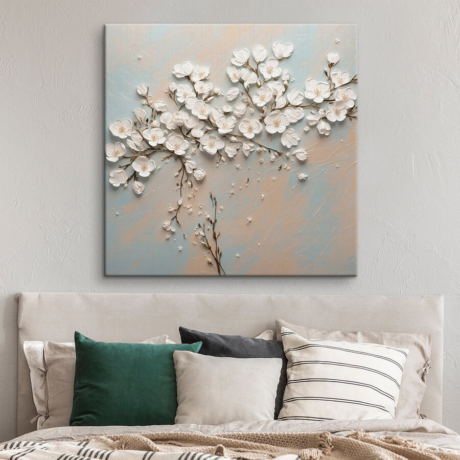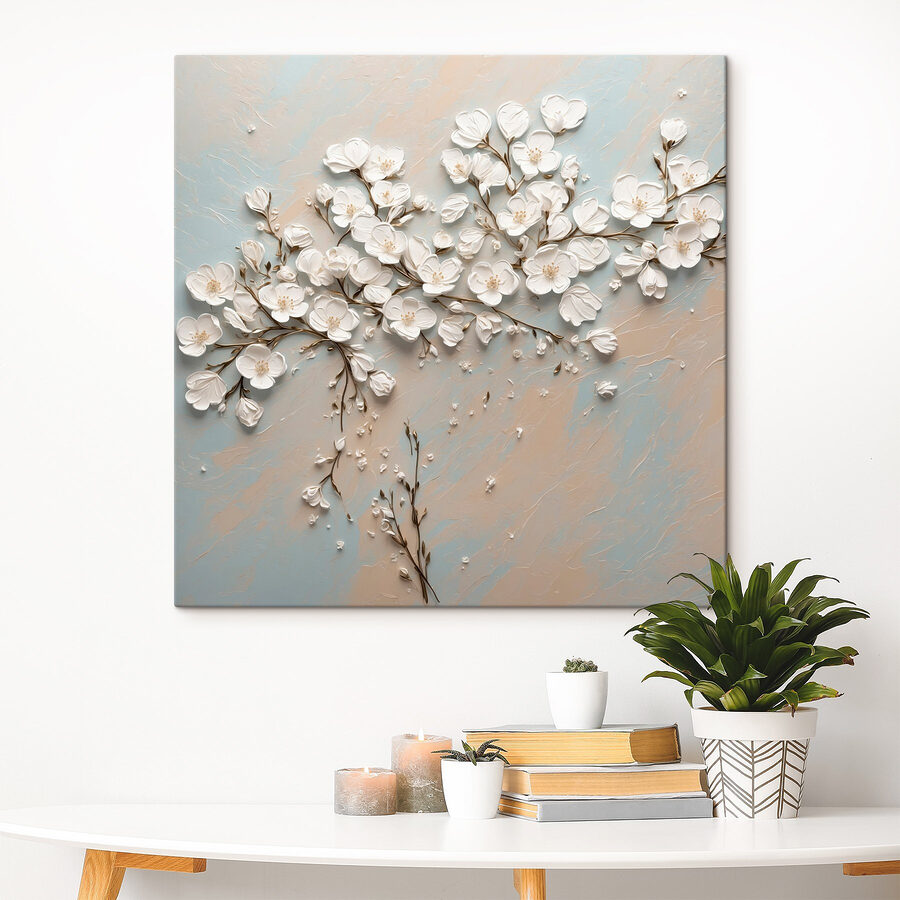 Fleur elke kamer op met deze betoverende canvasprint met delicate witte bloemen op een rustige blauwe en witte achtergrond. Stel je voor dat je de ruimte binnenloopt en je meteen een vrediger gevoel krijgt – het is als een frisse wind! Het zachte, luchtige ontwerp verandert een effen muur in een mooi centraal punt en nodigt uit tot warmte en charme. Perfect voor elke sfeer, of het nu een gezellig hoekje is of een levendige ontmoetingsplek, dit stuk zal zeker complimenten uitlokken. Wie wil er nou niet een kopje koffie drinken in een kamer die is aangekleed met zulke sierlijke bloemen? Het is kunst die levendig aanvoelt en de kamer moeiteloos bij elkaar brengt.
