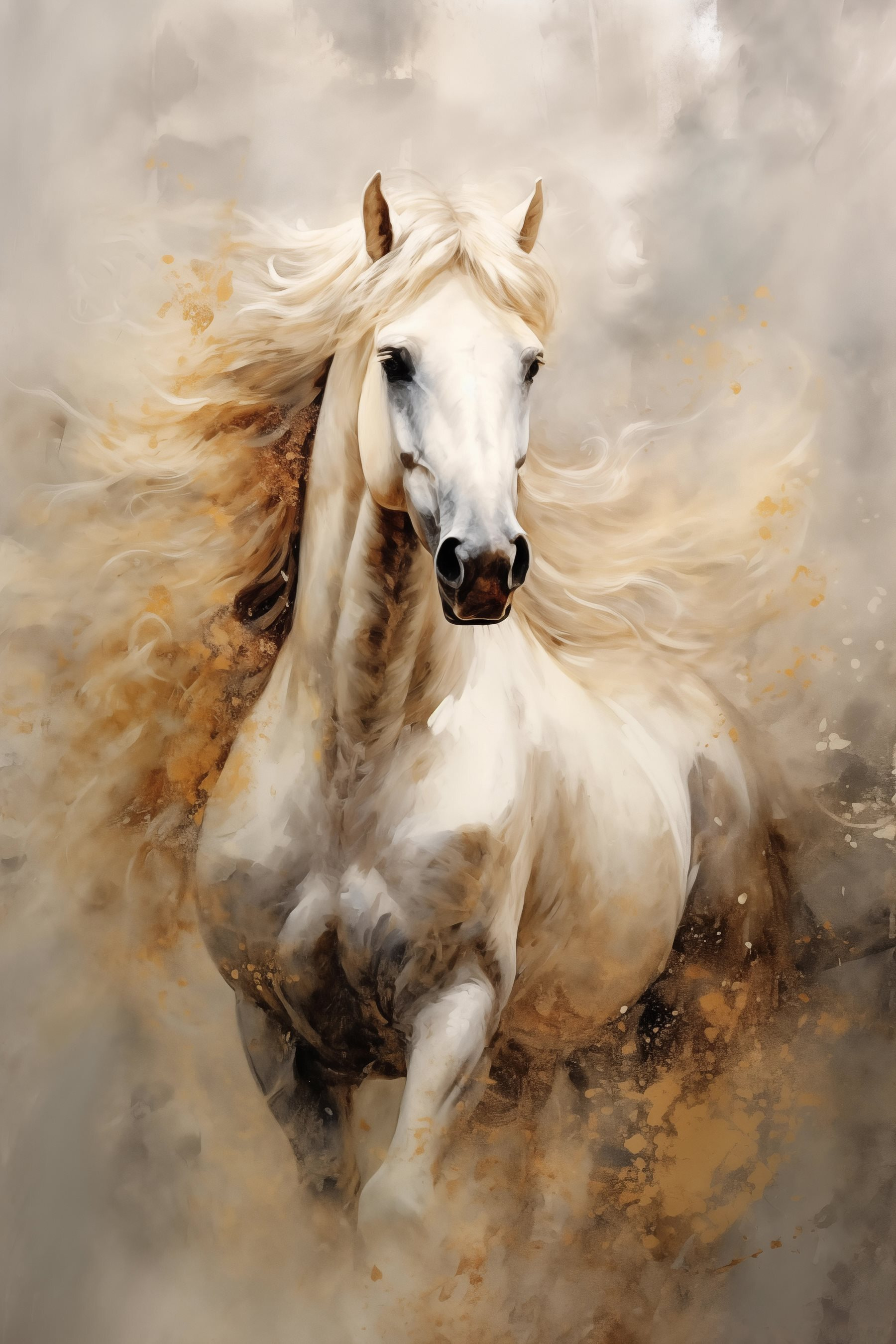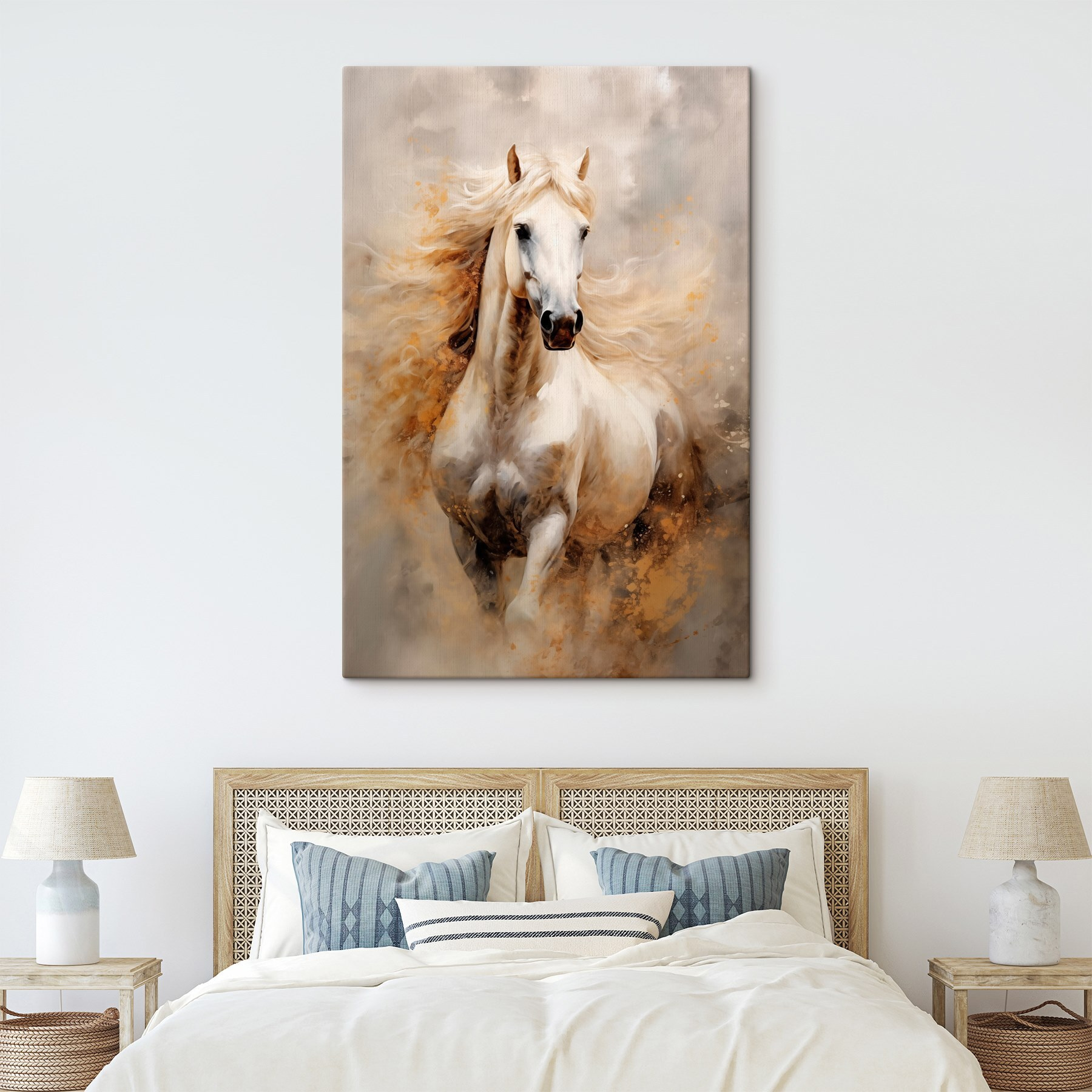 Transformeer uw ruimte met deze prachtige canvasprint van een majestueus wit paard, waarvan de golvende manen bijna geheimen van wilde avonturen fluisteren. Dit kunstwerk hangt niet alleen aan de muur, het betovert ook het hart. Stel je voor dat je erlangs loopt en er stiekem naar kijkt, alsof het zo je woonkamer binnen kan galopperen – of misschien zelfs als perfecte gespreksstarter kan dienen voor gasten die houden van een beetje paardensportmagie. De zachte tinten dansen in het licht en creëren een dromerige sfeer. Een vleugje elegantie, een snufje wilde geest – perfect voor iedereen die een beetje persoonlijkheid in zijn interieur wil brengen.