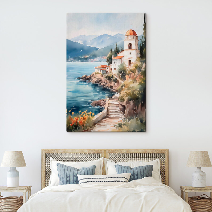 Verander uw muur in een serene ontsnapping met deze prachtige aquarel van een gebouw op een klif aan een glinsterend water. Het is alsof u in een dagdroom stapt, waar de zeewind geheimen fluistert en de bergen in al hun glorie de wacht houden. Stel je voor dat je lekker in je knusse hoekje zit, nippend aan je favoriete drankje, en je verliest je in de zachte tinten en subtiele penseelstreken. Het is precies het juiste vleugje reislust, dat ons herinnert aan vredige uitjes en zonnige avonturen. Perfect voor elke kamer, het zegt: “Het leven is te kort om niet van het uitzicht te genieten!” Maak je klaar voor een flinke dosis dagdromen!