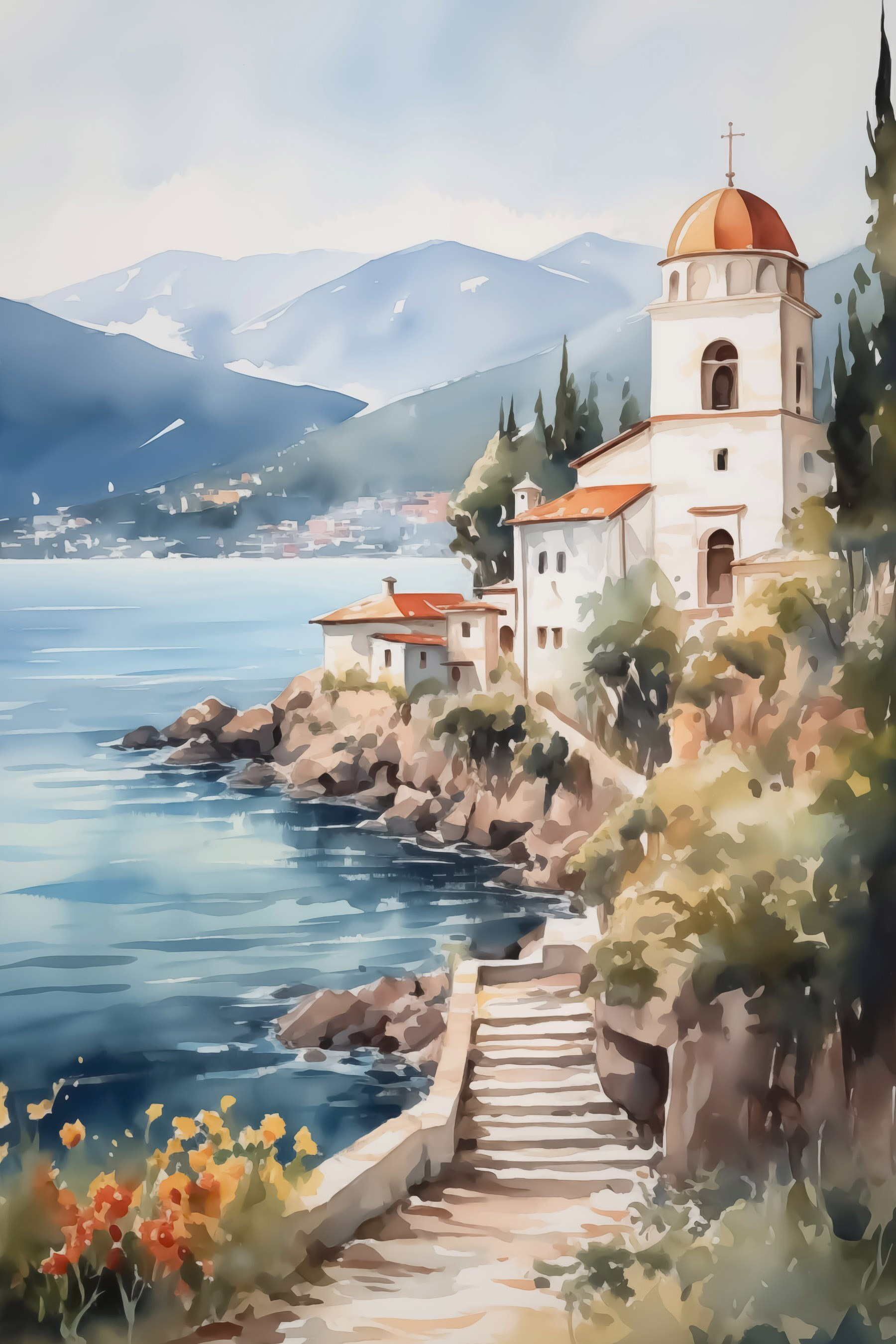 Verander uw muur in een serene ontsnapping met deze prachtige aquarel van een gebouw op een klif aan een glinsterend water. Het is alsof u in een dagdroom stapt, waar de zeewind geheimen fluistert en de bergen in al hun glorie de wacht houden. Stel je voor dat je lekker in je knusse hoekje zit, nippend aan je favoriete drankje, en je verliest je in de zachte tinten en subtiele penseelstreken. Het is precies het juiste vleugje reislust, dat ons herinnert aan vredige uitjes en zonnige avonturen. Perfect voor elke kamer, het zegt: “Het leven is te kort om niet van het uitzicht te genieten!” Maak je klaar voor een flinke dosis dagdromen!