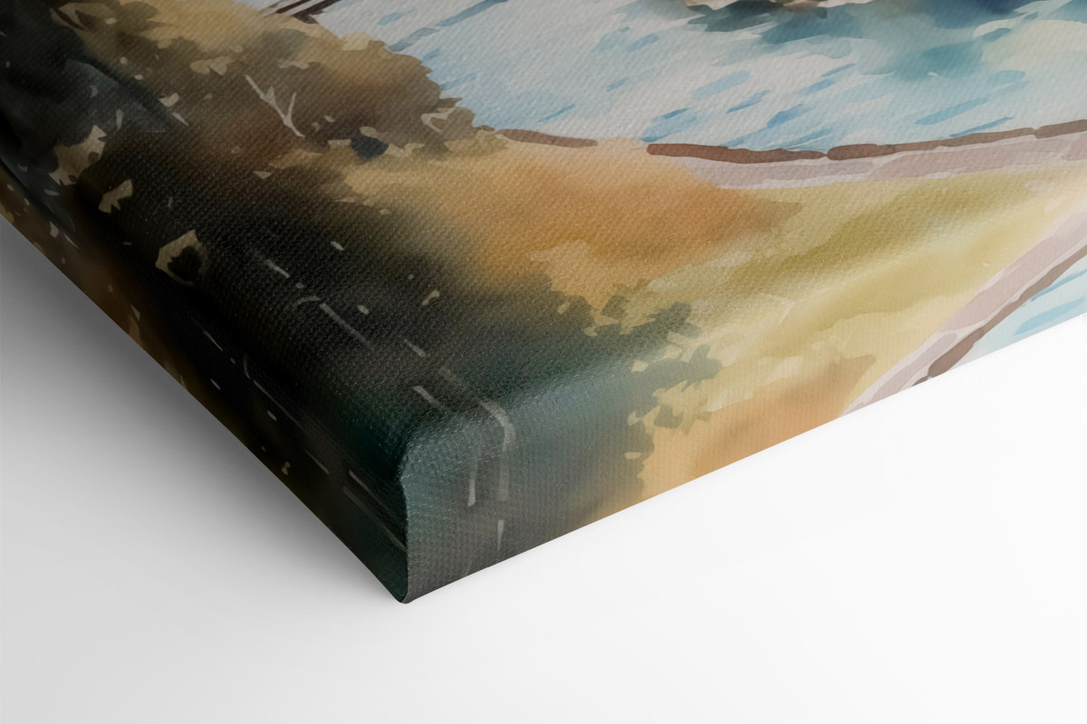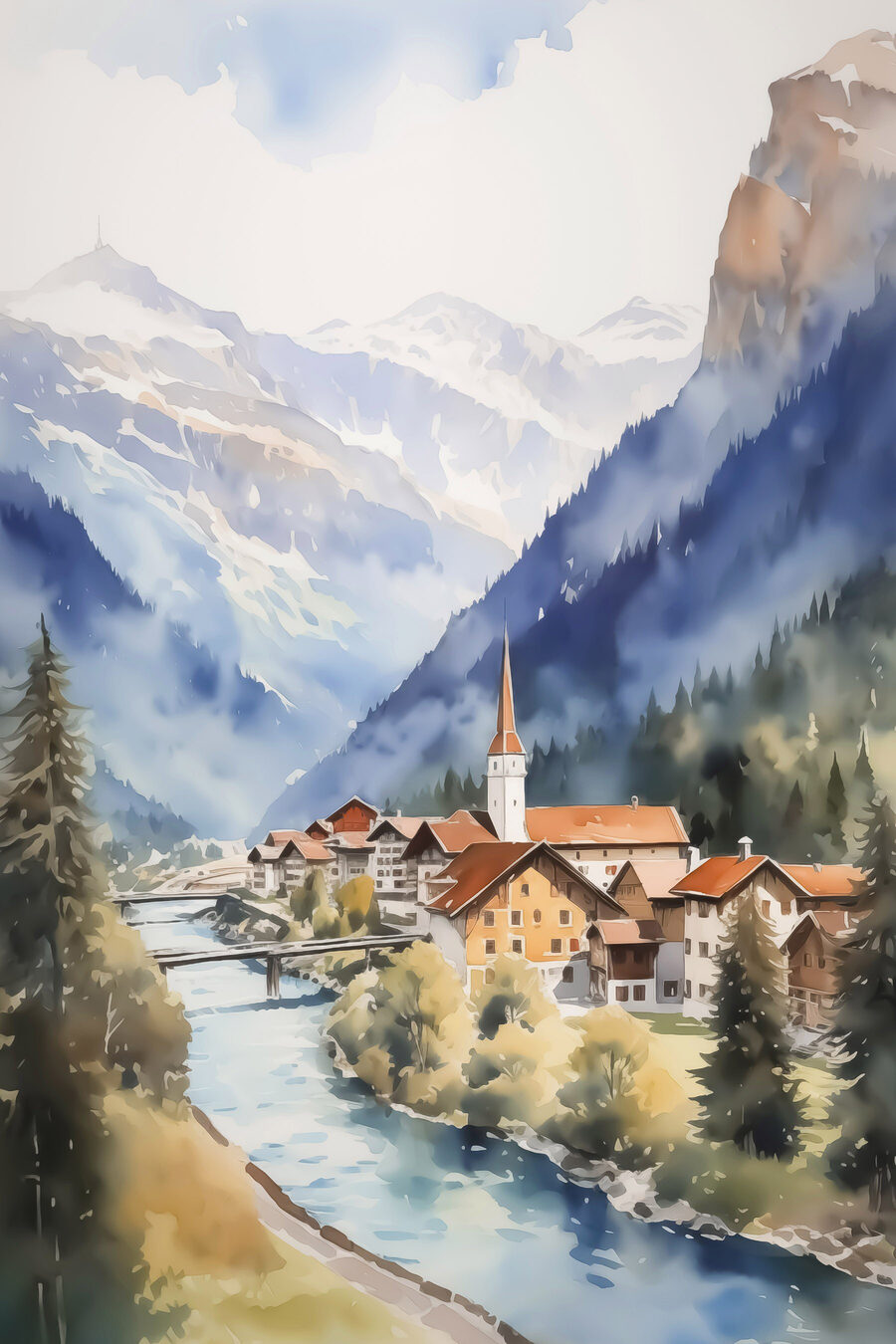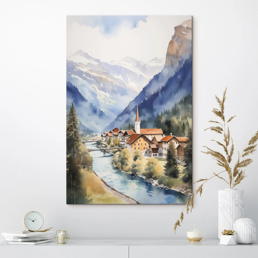 Stel je voor dat je een charmant dorpje binnenstapt, genesteld tussen torenhoge bergen. Deze aquarelprint op canvas legt precies dat vast: de serene schoonheid van een toevluchtsoord in de bergen. Zachte blauwtinten vermengen zich met warme aardetinten en creëren een gezellige sfeer waarin je je meteen thuis voelt. Hang het in je woonkamer en zie hoe het gesprekken op gang brengt over avonturen, verborgen toevluchtsoorden en dromen over reizen naar plekken als deze. De sierlijke penseelstreken van het schilderij brengen een gevoel van rust, net als een zacht briesje dat door de bomen ruist. En wie houdt er nou niet van een kunstwerk dat fluistert: “Ontspan, je bent op vakantie”? Perfect voor iedereen die dat vleugje natuur wil zonder de bank te verlaten!
