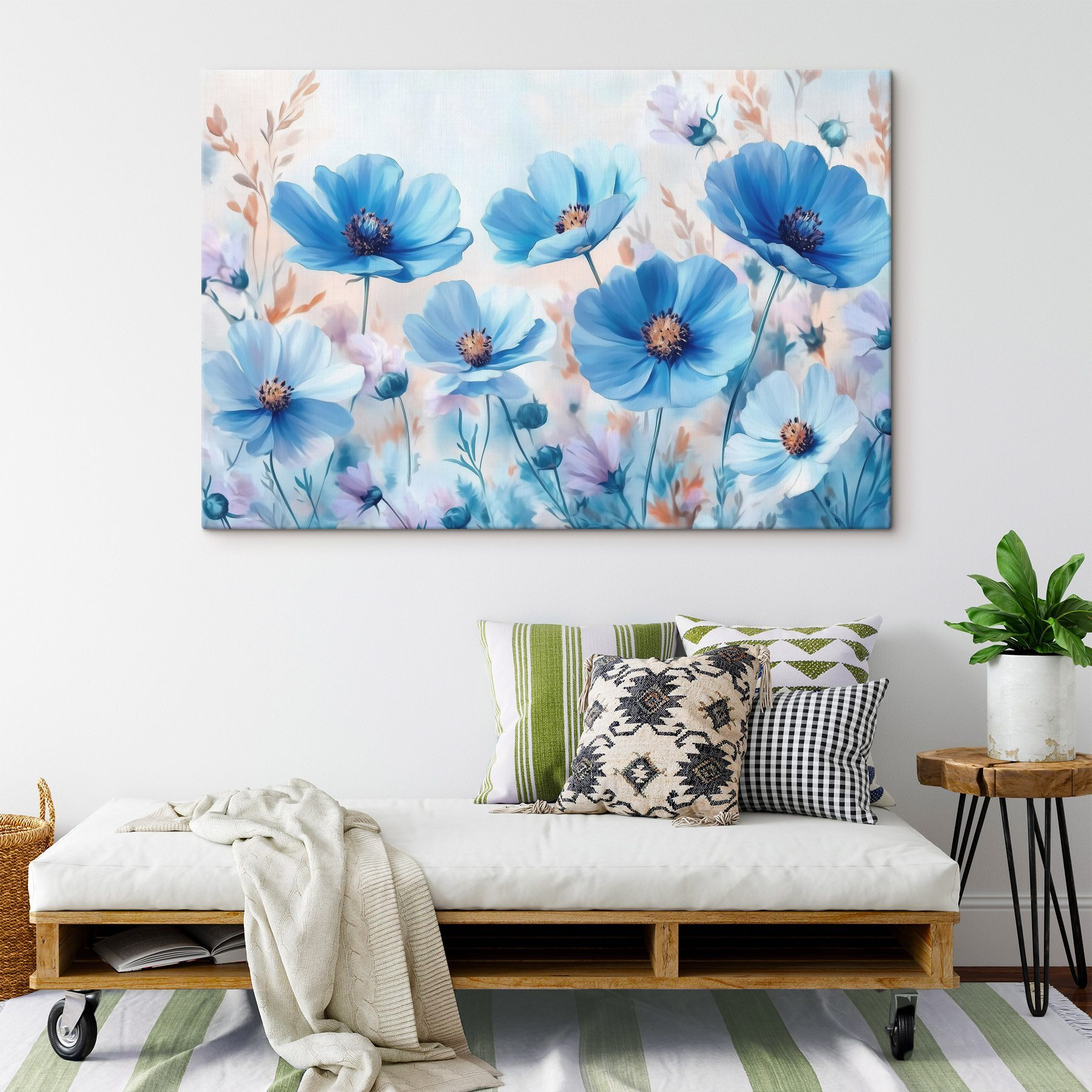 Brighten up any space with this stunning “Canvas prints Group of blue flowers.” Imagine walking into a room and being greeted by a fresh breeze of blue blossoms dancing softly against a pastel background. It’s like a little piece of nature, minus the pollen!