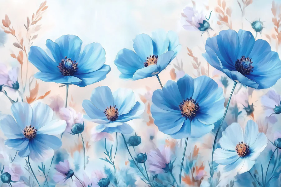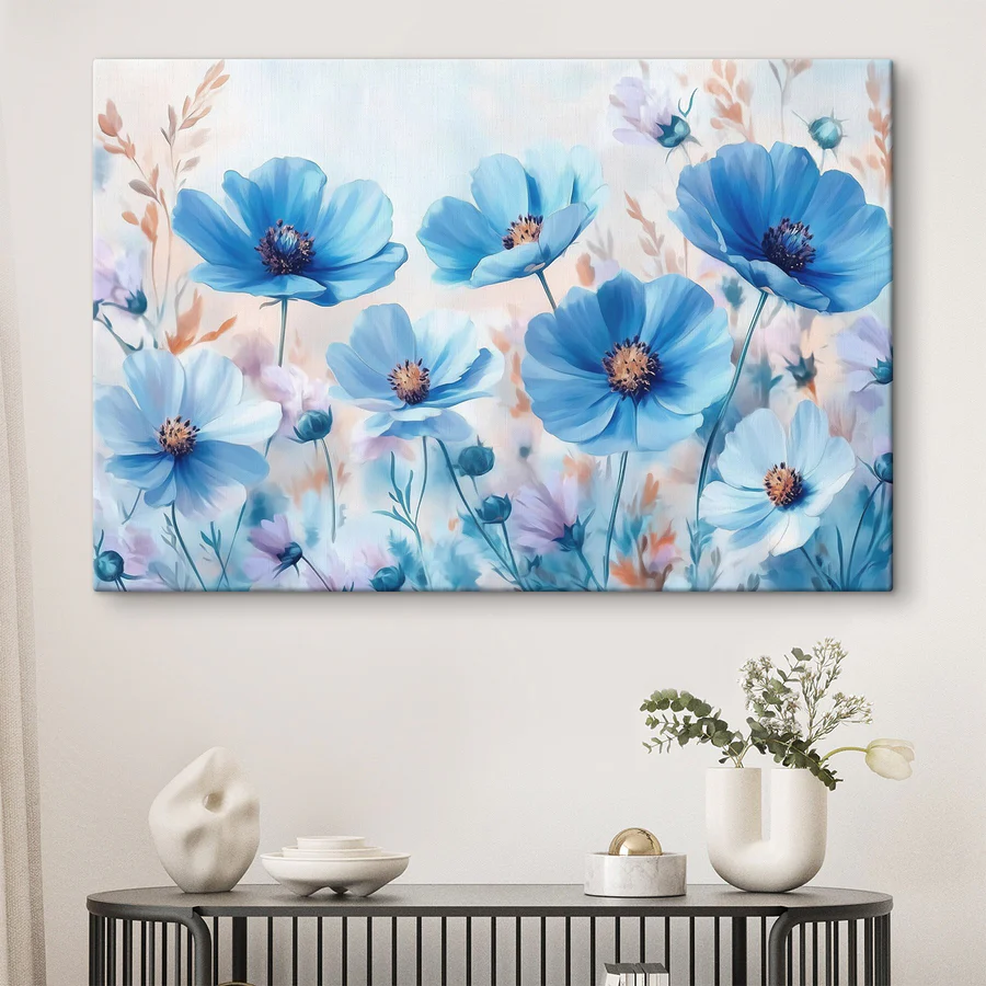 Brighten up any space with this stunning “Canvas prints Group of blue flowers.” Imagine walking into a room and being greeted by a fresh breeze of blue blossoms dancing softly against a pastel background. It’s like a little piece of nature, minus the pollen!