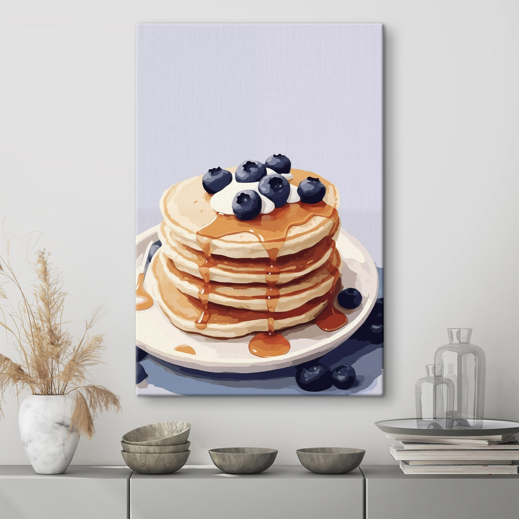 Imagine waking up to the delightful sight of a towering stack of pancakes, glistening with syrup and topped with plump blueberries. This canvas print captures that mouthwatering moment perfectly. Just picture it hanging in the kitchen, making every breakfast a celebration. It’s like inviting brunch into your home, minus the need for an apron or dish duty. Friends will smile, kids will giggle, and suddenly, even Monday mornings don’t seem so grim. This art isn’t just decor; it’s an invitation to enjoy life’s simple pleasures. Yum!