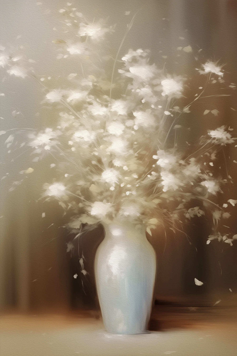 Fleur elke kamer op met deze prachtige canvasprint met een delicate witte vaas gevuld met etherische witte bloemen. Het is alsof de natuur heeft besloten een dutje te doen, zachtjes dromend in de hoek van je woonruimte. Stel je voor dat je langsloopt en een golf van rust over je heen voelt komen, de eenvoud brengt een glimlach op je gezicht. Het heeft een manier om alles precies goed te laten voelen – perfect voor die momenten dat je een beetje verfrissing nodig hebt. Of het nu in de gang is of boven een gezellige bank, dit stuk voegt een vleugje sereniteit toe dat moeilijk te weerstaan is. Bovendien past het bij zowat alles, dus laat je decoratiestijl bloeien terwijl het mooi staat. Je muren verdienen een beetje charme, toch?