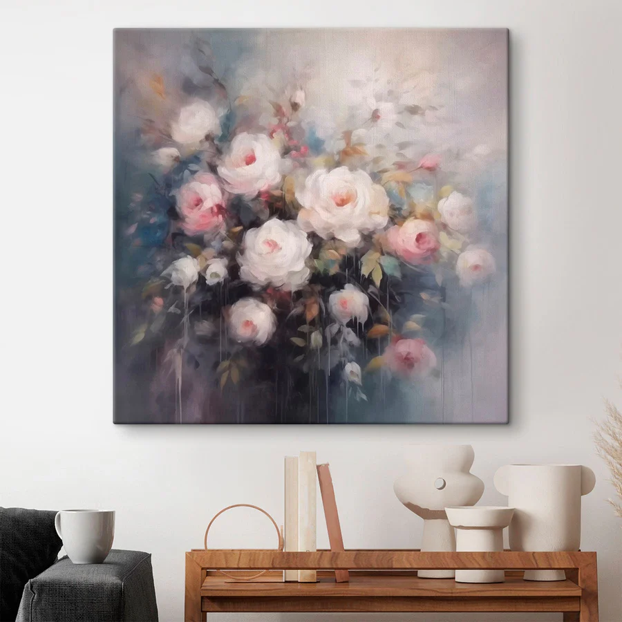 Fleur elke muur op met deze fascinerende canvasprint van bloemen in een vaas. Het is als een kleine tuin in je woonkamer die moeiteloos een vleugje warmte en charme toevoegt. Stel je voor dat je een ruimte binnenloopt waar zachte bloemblaadjes en zachte tinten je begroeten – het is als een gezellige knuffel voor je ogen. Dit kunstwerk zal zeker ook gesprekken op gang brengen! Vrienden vragen zich misschien af waar het prachtige boeket vandaan komt en jij glimlacht en zegt dat het magisch geschilderd is. Perfect om elke hoek vrolijk en uitnodigend te maken, fluistert dit stuk schoonheid en sereniteit in je huis.