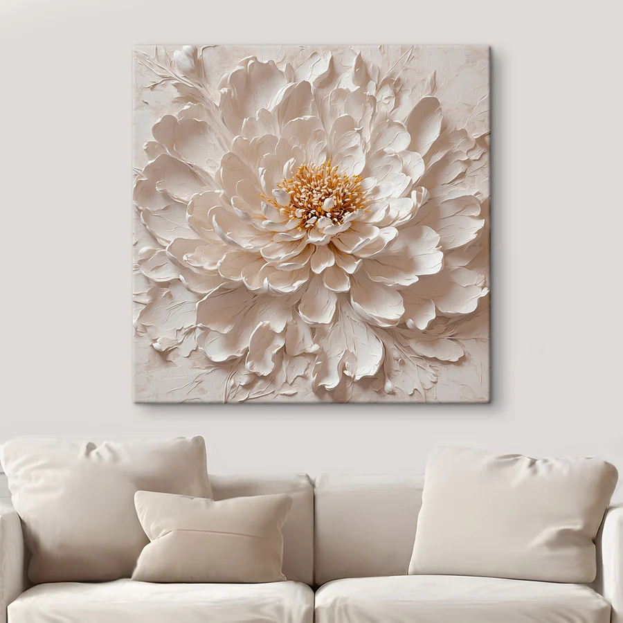 Maak kennis met een canvasprint die bijna elegantie uitstraalt: een prachtig bloemenmeesterwerk in zachte witte tinten. Het is alsof je een tuin in huis haalt zonder dat je je zorgen hoeft te maken over water geven. Stel je voor dat deze schoonheid een gezellige woonkamer verlicht of een serene sfeer toevoegt aan een slaapkamer. De oversized bloei valt op, trekt de aandacht en voelt toch verfrissend rustig aan. En laten we eerlijk zijn, wie voelt zich niet een beetje gelukkiger omringd door bloemen? Dit sieraad decoreert niet alleen, het nodigt ook warmte en positieve vibraties uit in de ruimte. Perfect voor mensen die de kleine dingen waarderen, zoals een goed geplaatste bloem of een vleugje charme in hun huis. Transformeer elke hoek met dit bloemengenot en laat de goede gevoelens stromen.