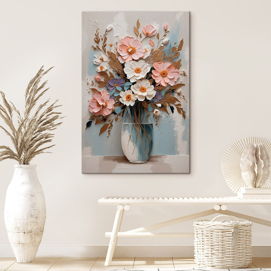 Fleur je kamer op met deze levendige canvasprint van bloemen in een vaas, een charmante toevoeging die warmte en vrolijkheid uitstraalt. Zie het al voor je boven je bank of in een gezellige hoek – onmiddellijke sfeermaker, toch? Die speelse bloemen, met zoveel flair geschilderd, lijken zachtjes te wiegen en nodigen uit tot vrolijkheid in de kamer. Het is alsof je een kleine tuin binnenshuis hebt, zonder het vervelende water geven. Vrienden kunnen even pauzeren, diep inademen en glimlachen. Perfect om een vleugje persoonlijkheid toe te voegen aan elke muur, fluistert dit stuk, “Het leven is te kort – geniet van de schoonheid!”. Geef je muren iets om over te praten.