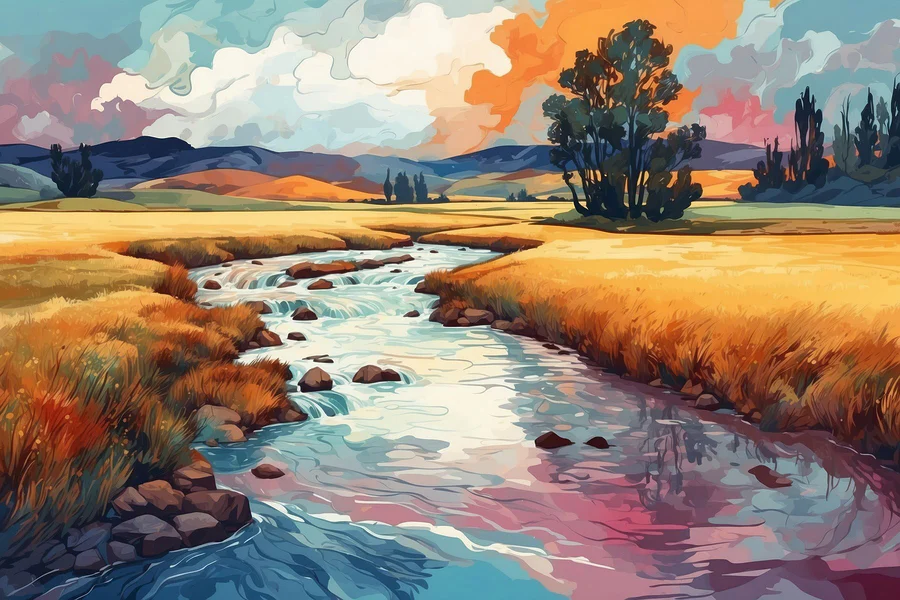 Stel je een zonovergoten middag voor, waar een zachte rivier door velden met goudkleurig gras kronkelt en het decor vormt voor dromen over zomeravonturen. Met deze canvasprint haal je die rust in huis. Het levendige blauw en warme geel dansen samen en geven leven aan elke hoek die het siert. Stel je het voor boven een knusse bank of in een hal, waar het bij elke blik een gevoel van rust verspreidt. Het is als een kleine ontsnapping die je herinnert aan de schoonheid van de natuur, zelfs op drukke dagen. Perfect voor wie gelooft dat er magie schuilt in het alledaagse – deze print nodigt uit tot dagdromen en een glimlach.
