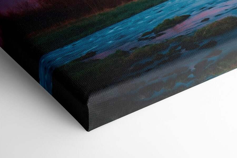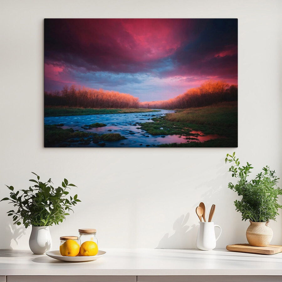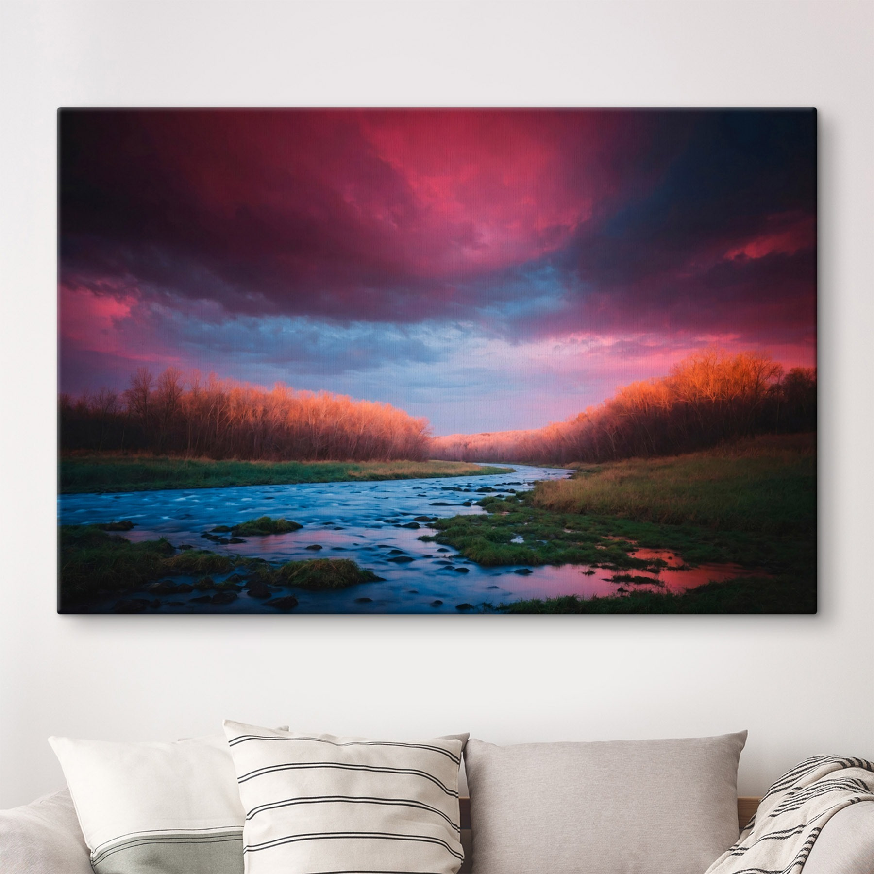Stel je voor dat je een gezellige kamer binnenloopt en begroet wordt door een serene rivier die door een weelderig bos kronkelt, net als deze betoverende canvasprint. Het is niet zomaar kunst; het is een kleine ontsnapping. Het zachte blauw van het water danst met de warme tinten van de bomen en creëert een rustgevende sfeer die van elke muur een vredig toevluchtsoord maakt. Perfect om lekker in weg te kruipen met een boek of om koffie te drinken terwijl je dagdroomt over avonturen in de natuur. Wie houdt er nu niet van een vleugje wildernis binnenshuis? Het is net alsof je de natuur in huis haalt – zonder de insecten natuurlijk!