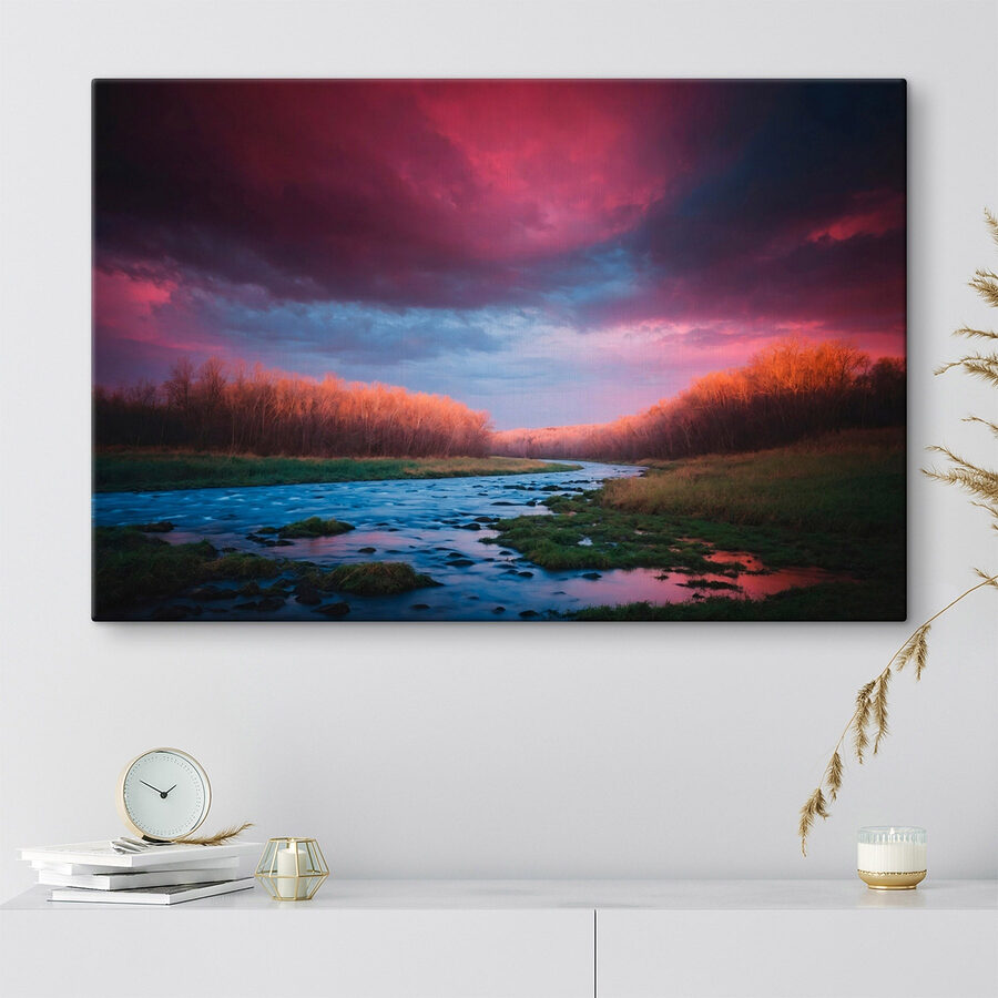 Stel je voor dat je een gezellige kamer binnenloopt en begroet wordt door een serene rivier die door een weelderig bos kronkelt, net als deze betoverende canvasprint. Het is niet zomaar kunst; het is een kleine ontsnapping. Het zachte blauw van het water danst met de warme tinten van de bomen en creëert een rustgevende sfeer die van elke muur een vredig toevluchtsoord maakt. Perfect om lekker in weg te kruipen met een boek of om koffie te drinken terwijl je dagdroomt over avonturen in de natuur. Wie houdt er nu niet van een vleugje wildernis binnenshuis? Het is net alsof je de natuur in huis haalt – zonder de insecten natuurlijk!