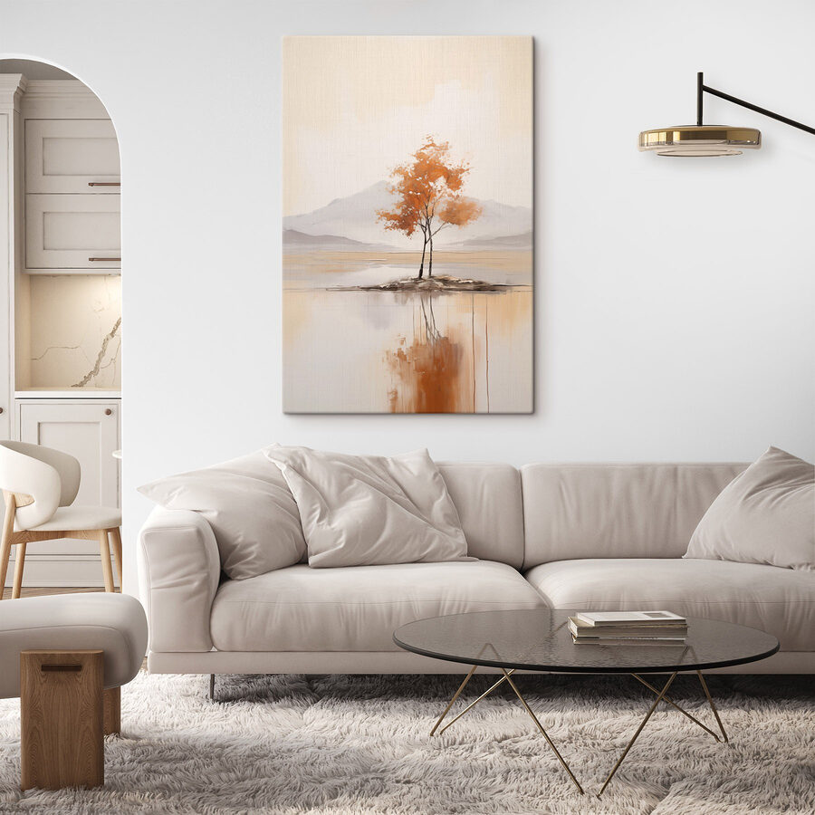 Imagine a serene moment by the water—this canvas brings that vibe home. A stunning tree stands alone, draped in warm orange leaves, making you feel like you’re sipping tea on a quiet island. It’s almost a little secret between you and nature, isn’t it? The gentle colors soothe the eye, while the reflections ripple beneath the surface, reminding everyone to slow down and take a breath. Perfect for a living room or a cozy corner, this piece turns any space into a tranquil retreat. Who wouldn’t want to escape here for a moment? It’s not just art; it’s a feeling.