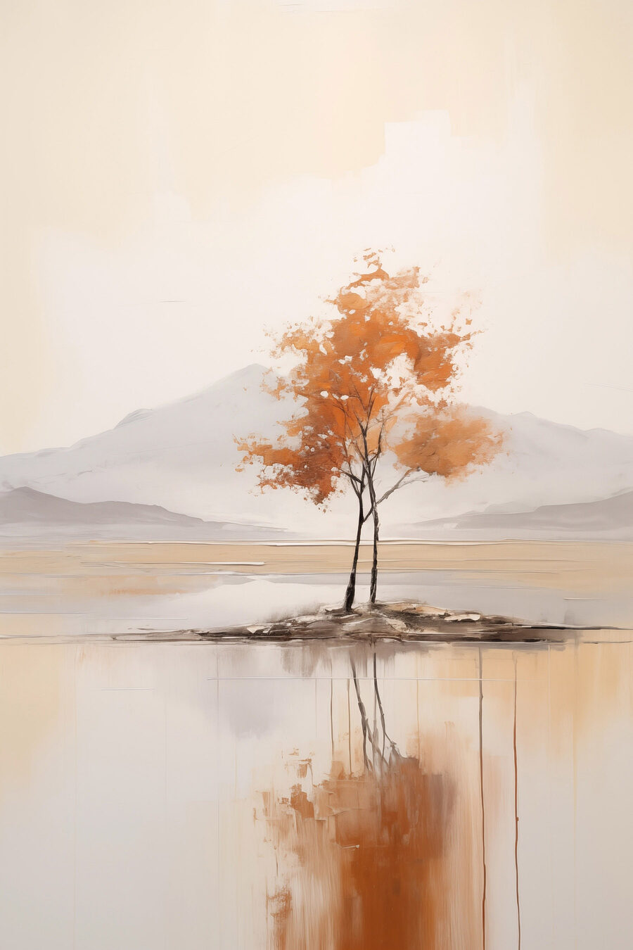 Imagine a serene moment by the water—this canvas brings that vibe home. A stunning tree stands alone, draped in warm orange leaves, making you feel like you’re sipping tea on a quiet island. It’s almost a little secret between you and nature, isn’t it? The gentle colors soothe the eye, while the reflections ripple beneath the surface, reminding everyone to slow down and take a breath. Perfect for a living room or a cozy corner, this piece turns any space into a tranquil retreat. Who wouldn’t want to escape here for a moment? It’s not just art; it’s a feeling.