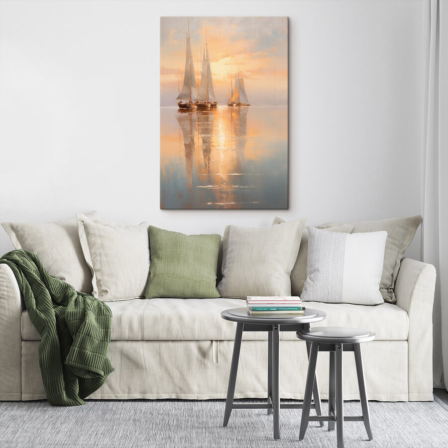 Stel je voor dat je elke keer dat je naar dit prachtige doek met zeilboten op een kalme zee kijkt, een serene wereld binnenstapt. De zachte tinten van de zonsondergang verspreiden warmte over de hemel, waardoor het voelt als een gezellige omhelzing. Dit kunstwerk hangt niet zomaar aan de muur; het nodigt uit tot luie middagen met een glas limonade en dagdromen over verre kusten. Stel je voor dat gasten je ruimte binnenkomen en even de tijd nemen om de serene sfeer in zich op te nemen. Elke blik is een kleine ontsnapping – perfect voor iedereen die van de natuur en de rust van de oceaan houdt. Bovendien kan het je misschien inspireren tot een onverwacht zeilavontuur – wie weet?