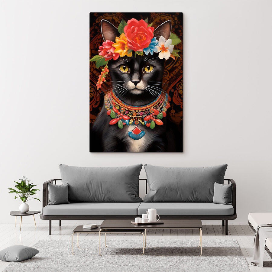 Transformeer je ruimte met deze prachtige canvasprint met een schattige kat met een bloemenkroon op. Echt, wat is er niet leuk aan? Deze kleine katachtige fashionista is gekleed om indruk te maken, met een bos kleurrijke bloemen die zelfs de somberste dag kunnen opvrolijken. Stel je voor dat hij aan je muur hangt en elke kamer meteen een beetje vrolijker en een stuk eigenzinniger maakt.