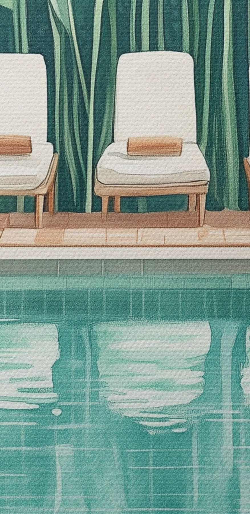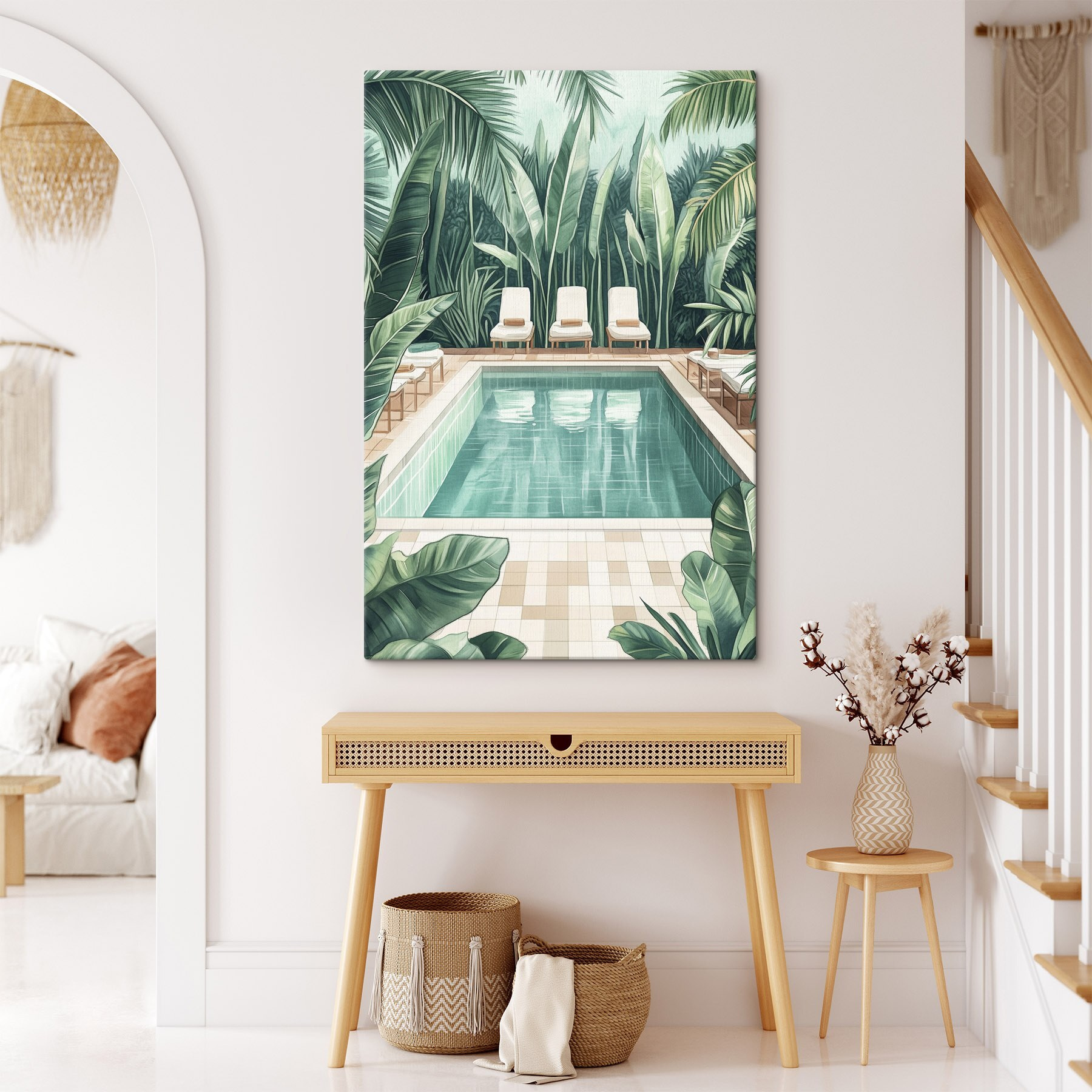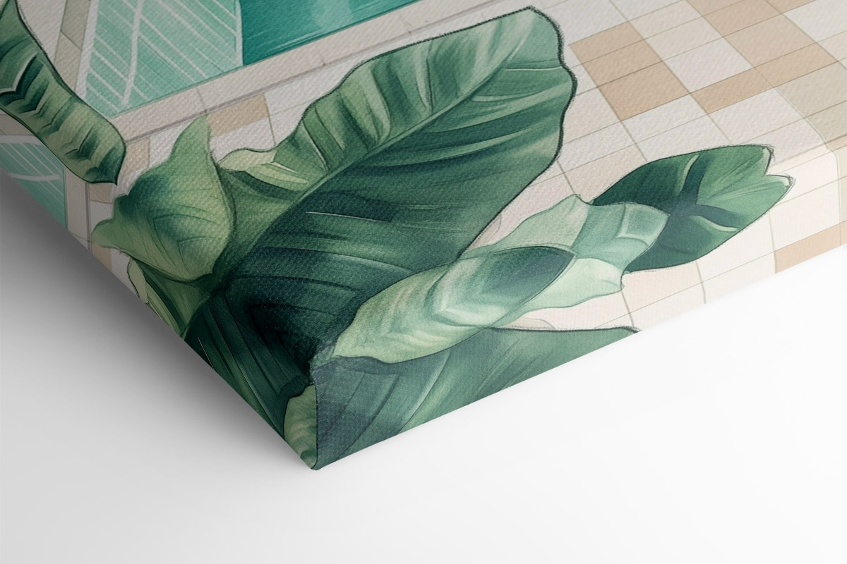 Stel je voor dat je een serene oase binnenstapt telkens als je de kamer binnenloopt. Deze fascinerende canvasprint, met een rustig zwembad omarmd door weelderig groen, doet precies dat. Het fluistert ontspanning, als een zacht briesje op een warme dag. Stel je voor dat je wegzakt in een van die gezellige loungestoelen, met een drankje in de hand, terwijl de levendige bladeren zachtjes wiegen. Het is een stukje paradijs, perfect om een saaie muur te veranderen in iets levendigs en uitnodigends. Vrienden zullen langslopen en vragen: “Waar is die vakantieplek?” En jij zult glimlachen, want thuis kan ook een uitje zijn.