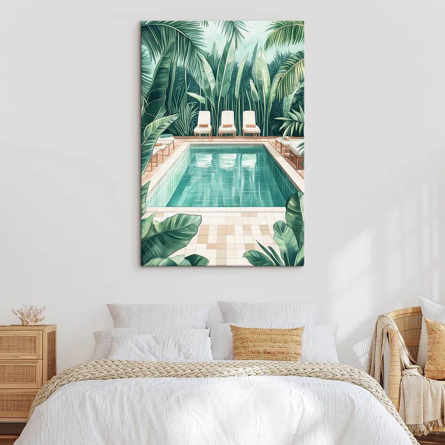 Stel je voor dat je een serene oase binnenstapt telkens als je de kamer binnenloopt. Deze fascinerende canvasprint, met een rustig zwembad omarmd door weelderig groen, doet precies dat. Het fluistert ontspanning, als een zacht briesje op een warme dag. Stel je voor dat je wegzakt in een van die gezellige loungestoelen, met een drankje in de hand, terwijl de levendige bladeren zachtjes wiegen. Het is een stukje paradijs, perfect om een saaie muur te veranderen in iets levendigs en uitnodigends. Vrienden zullen langslopen en vragen: “Waar is die vakantieplek?” En jij zult glimlachen, want thuis kan ook een uitje zijn.