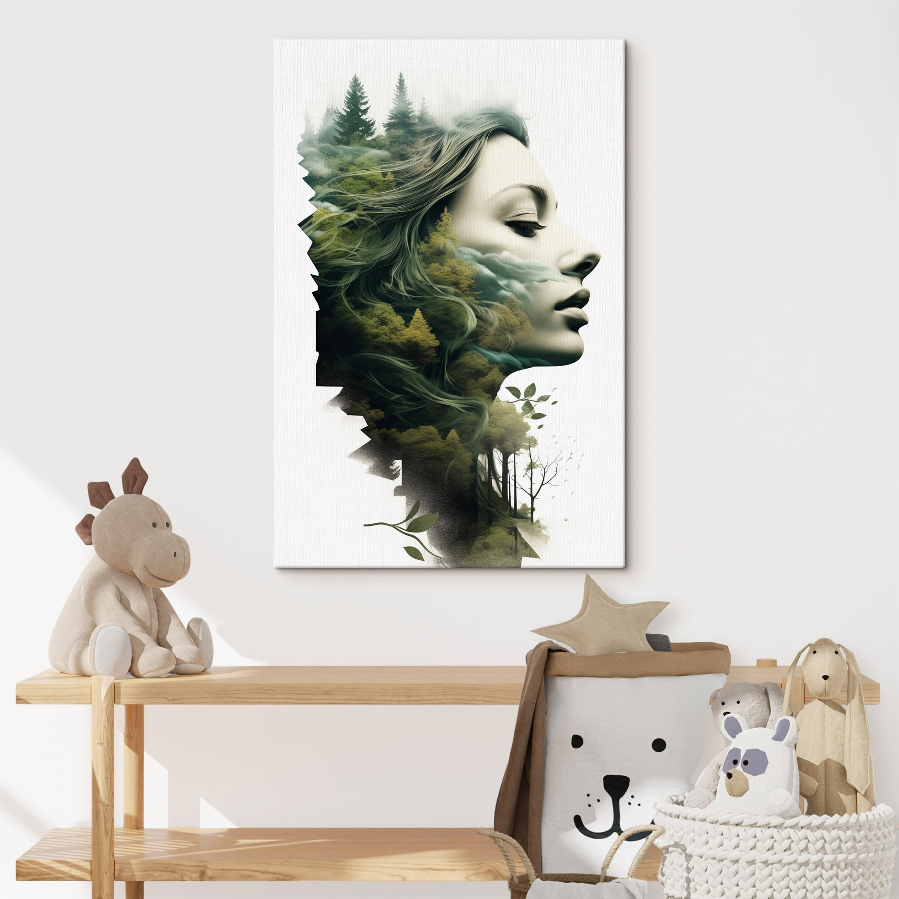 Stap in een dromerige ontsnapping met deze betoverende canvasprint met het gezicht van een vrouw verweven met bomen en wolken. Het is alsof de natuur haar een geheim influisterde en ze niet anders kon dan het delen. Dit kunstwerk is perfect voor iedereen die houdt van een beetje eigenzinnigheid in zijn of haar interieur. Stel je voor dat het in een gezellig leeshoekje hangt – zacht licht dat naar binnen schijnt, een warm kopje in de hand. Het voelt alsof de natuur bij je is en uitnodigt tot momenten van reflectie en dagdromen. Over een gespreksstarter gesproken!