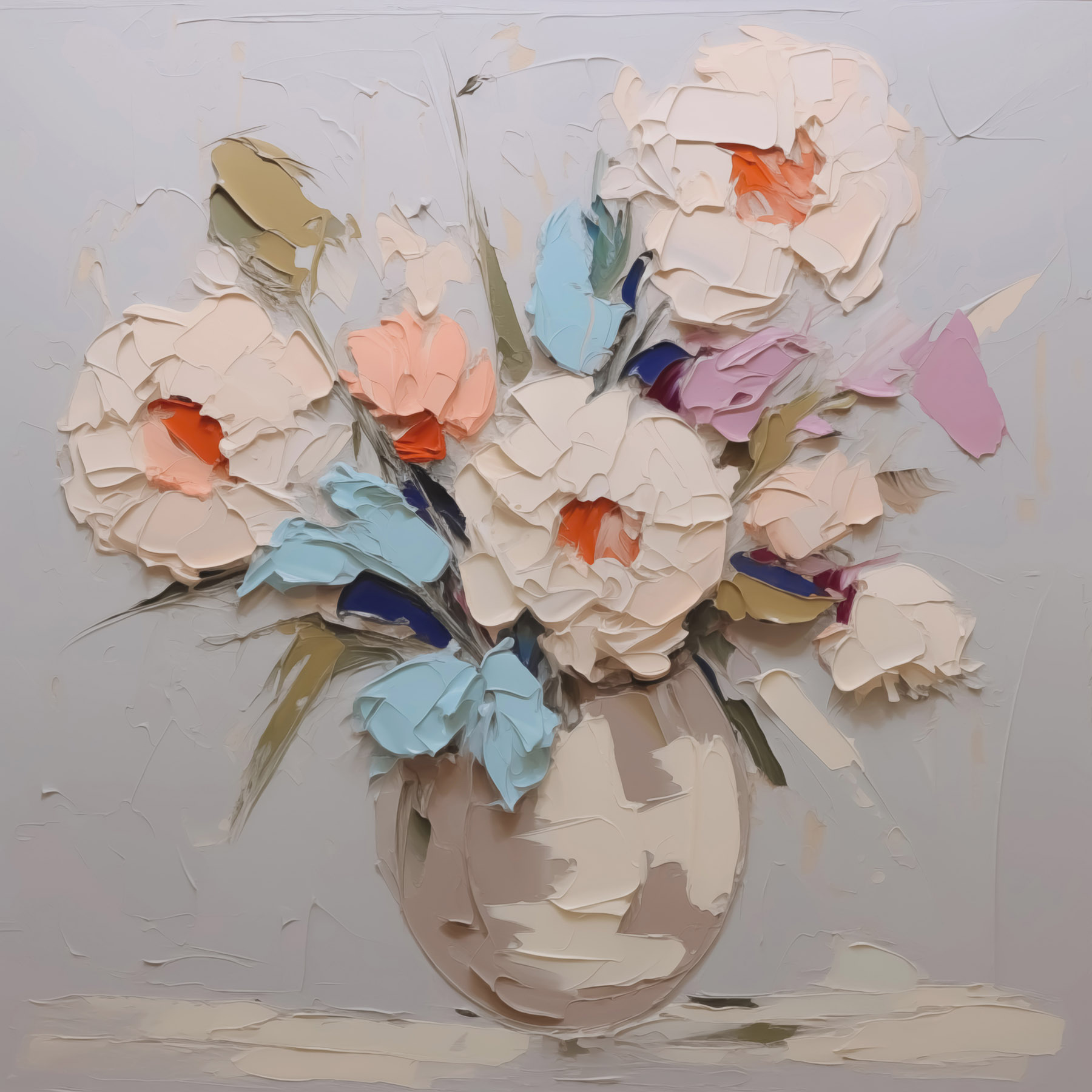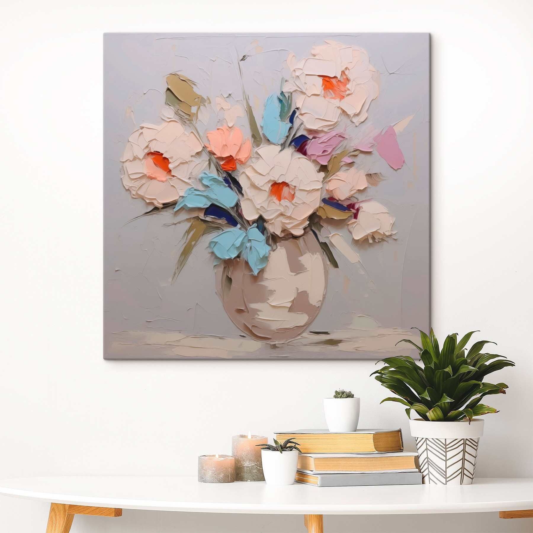 Transformeer je kamer met deze canvasprint met een prachtig boeket bloemen in een vaas. Het is net alsof je een beetje lente in huis haalt, ongeacht het seizoen. Stel je voor dat je ‘s ochtends aan je koffie nipt terwijl die levendige kleuren je dag opfleuren. De zachte pasteltinten zijn een streling voor het oog en dat speelse oranje? Pure vreugde. Perfect voor een gezellige woonkamer of een vrolijk hoekje, het zou zomaar een gesprek of twee op gang kunnen brengen. En wie houdt er nu niet van een beetje bloemige charme om de stemming wat op te vrolijken? Het gaat allemaal om die kleine momenten, toch?
