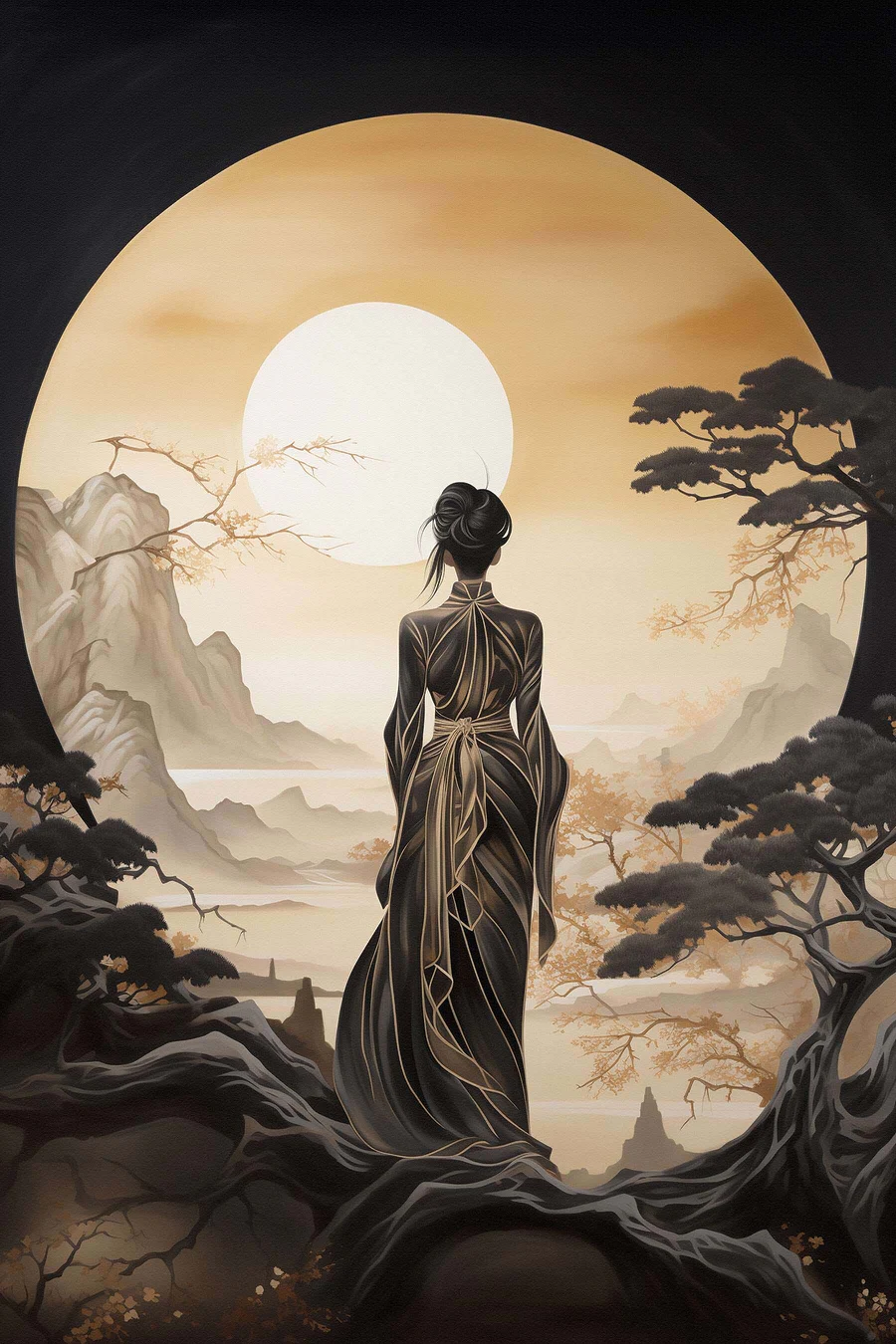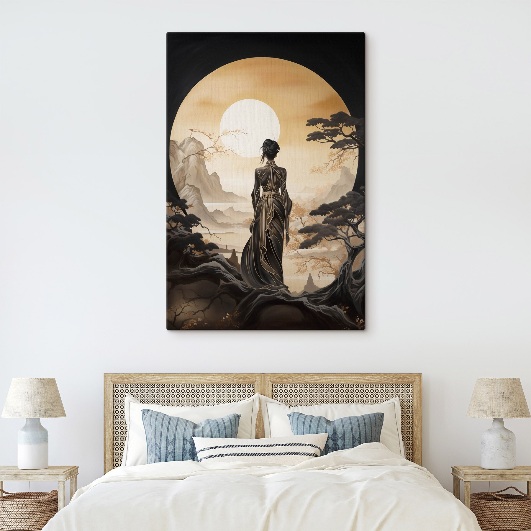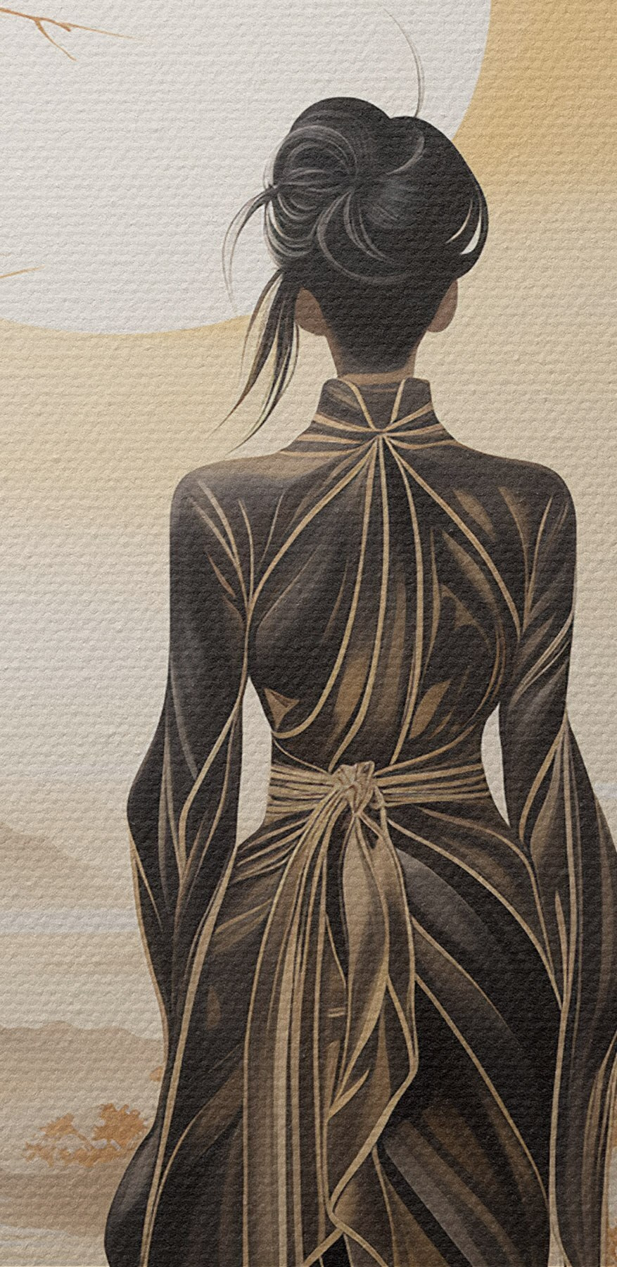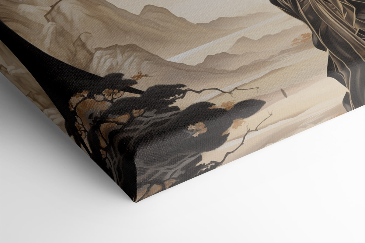 Stel je voor dat je een serene wereld binnenstapt waar een vrouw in een vloeiende jurk in gedachten verzonken naar de zon staart. Deze canvasprint legt die magie perfect vast. De warme tinten nodigen uit om tot rust te komen, waardoor het een geweldige aanwinst is voor elke muur. Stel je voor dat het je woonkamer of knusse hoekje siert en een gevoel van rust en reflectie oproept. Het is als een zachte herinnering aan rustige momenten, misschien zelfs een aansporing om even stil te staan en te genieten van de kleine dingen. Voor kunstliefhebbers of iedereen die een vleugje elegantie wil, voelt deze print als een perfecte gespreksstarter – wie wil er nu niet praten over de schoonheid van de natuur en de verhalen die het inspireert?