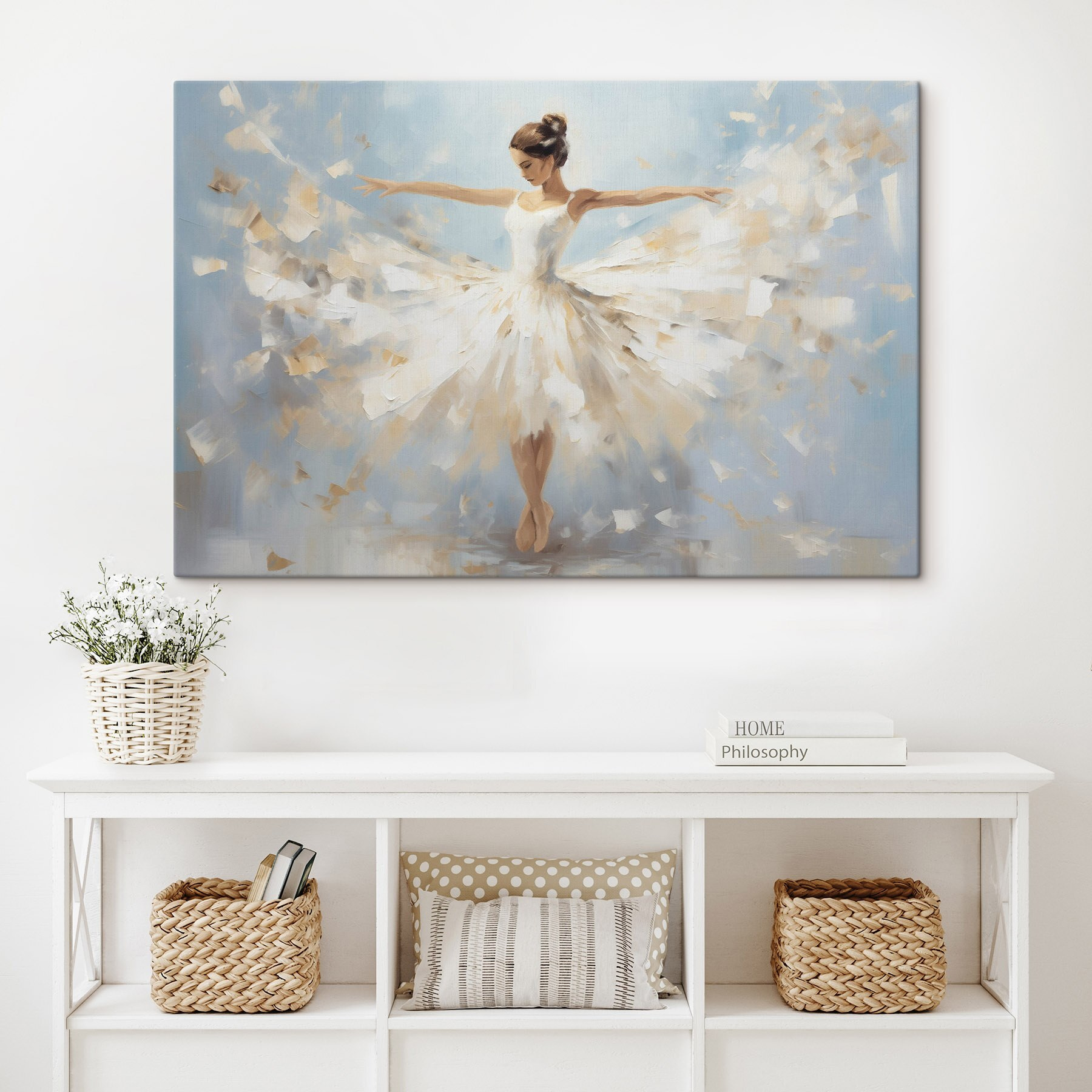 Stel je voor dat je een ruimte binnenstapt die lichter aanvoelt, alsof de lucht is besprenkeld met een beetje magie. Deze canvasprint toont een vrouw in een vloeiende witte jurk, gracieus draaiend alsof ze verdwaald is in een moment van gelukzaligheid. De zachte tinten mengen prachtig en brengen een vleugje sereniteit in elke kamer. Het is het soort kunstwerk dat spreekt als woorden tekortschieten. Hang het boven een gezellige leeshoek of verfraai een galerijmuur – vrienden zullen worden aangetrokken en opeens is het een gespreksstarter! Perfect voor wie houdt van elegantie zonder poespas. Het kan een beetje warmte toevoegen of dagdromen inspireren, waardoor elke blik een zoete ontsnapping wordt.