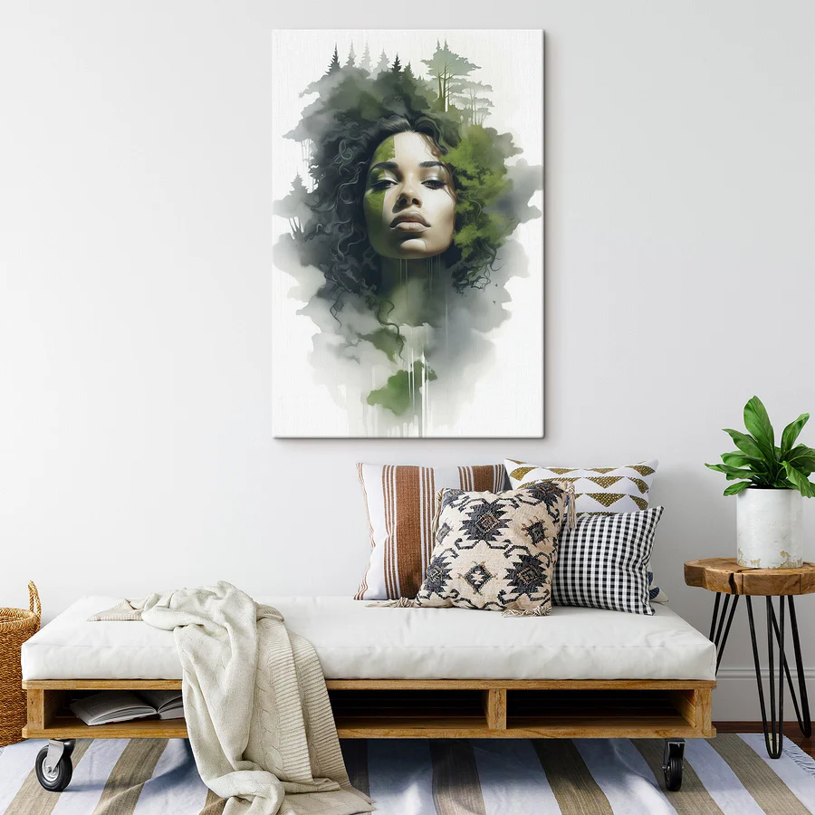 Deze canvasprint, “Woman with Green Leaves on Her Face”, is als een frisse wind voor elke ruimte. Stel je voor dat je een kamer binnenloopt en verwelkomd wordt door een serene sfeer die de geheimen van de natuur fluistert. De mix van aardse groentinten en zachte tinten roept een gevoel van kalmte op, bijna zoals het zachte geritsel van bladeren op een winderige dag. Het is perfect om een gezellig hoekje te creëren of een intrigerend effect toe te voegen aan een galerie.