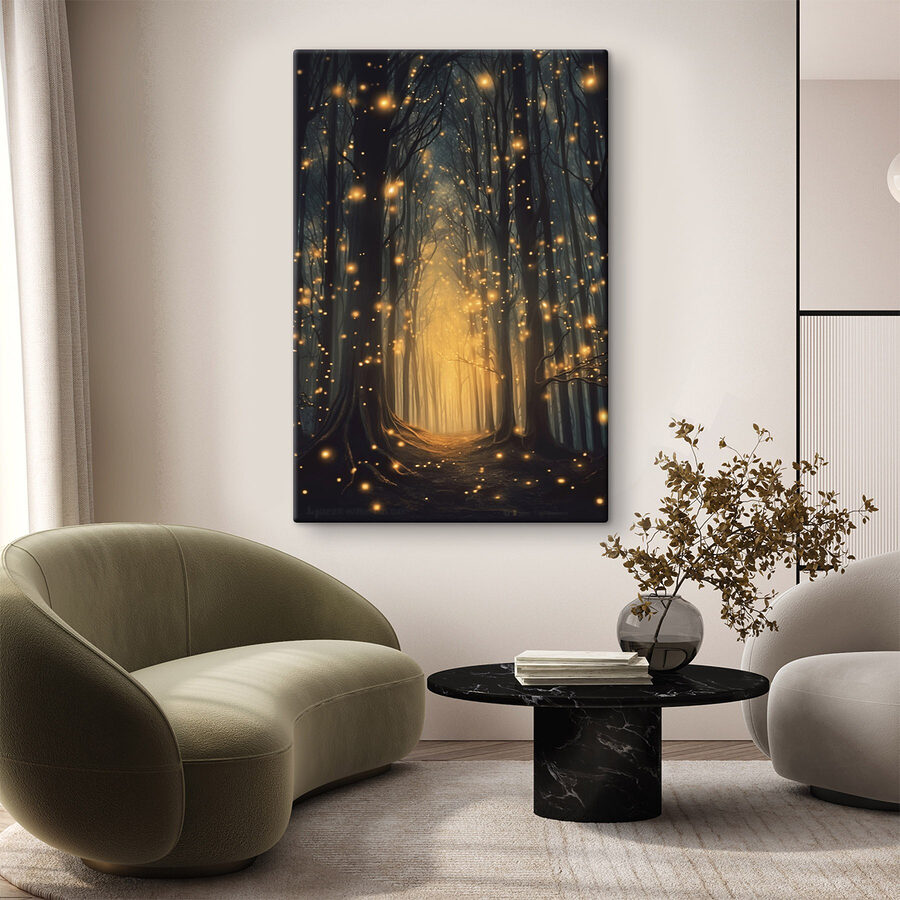 Stap in een magisch moment met deze canvasprint, “Pad door een bos met veel bomen met lichtjes”. Het is alsof je een sprookje binnenstapt, waar gloeiende lichtbollen vreugde verspreiden tussen torenhoge bomen. Stel je voor dat je thee drinkt terwijl dit kunstwerk een vleugje verwondering toevoegt aan je woonkamer. Het creëert een serene sfeer – perfect voor gezellige gesprekken of diepe gedachten.