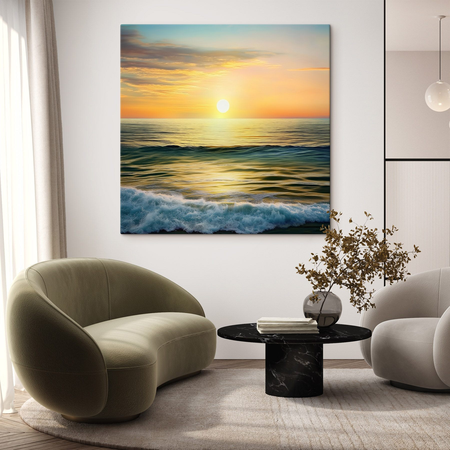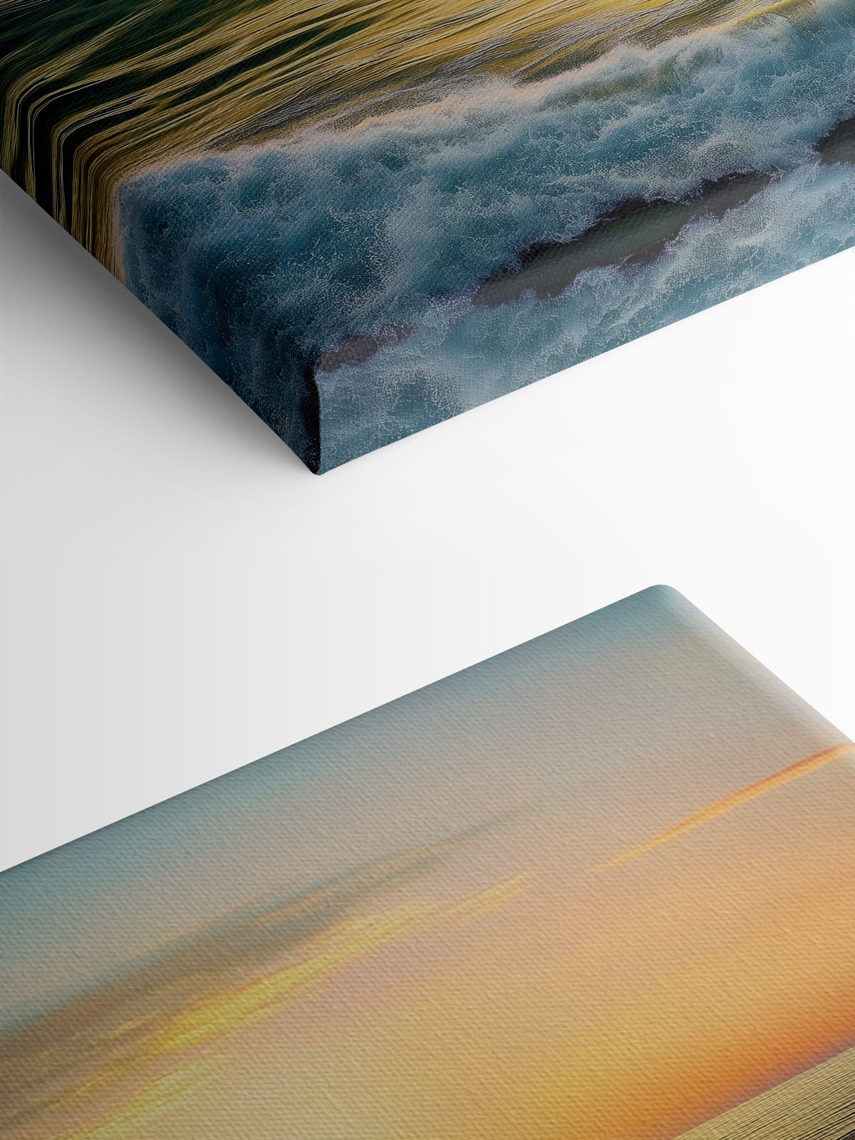 Stel je voor: de zon die net laag genoeg staat om de lucht te bespatten met zachte kleuren, terwijl de golven zachtjes aanrollen en geheimen van de zee fluisteren. Deze canvasprint, “Zonsondergang over een waterlichaam”, brengt dat serene moment vol ontzag je kamer binnen. Stel je voor dat je aan een kopje thee nipt, je favoriete boek in de buurt hebt en verdwaalt in de warme gloed van de zonsondergang die een vredige sfeer uitstraalt. Het voelt als een mini-ontsnapping, waar stress gewoon wegsmelt, en plotseling voelt elke avond als een stranduitstapje. Perfect om een woonkamer of gezellig hoekje op te fleuren; het is als een zonnige knuffel voor je muren. Je kunt de golven bijna horen!