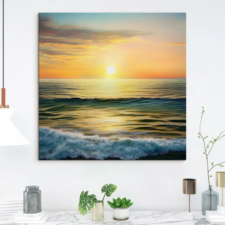 Stel je voor: de zon die net laag genoeg staat om de lucht te bespatten met zachte kleuren, terwijl de golven zachtjes aanrollen en geheimen van de zee fluisteren. Deze canvasprint, “Zonsondergang over een waterlichaam”, brengt dat serene moment vol ontzag je kamer binnen. Stel je voor dat je aan een kopje thee nipt, je favoriete boek in de buurt hebt en verdwaalt in de warme gloed van de zonsondergang die een vredige sfeer uitstraalt. Het voelt als een mini-ontsnapping, waar stress gewoon wegsmelt, en plotseling voelt elke avond als een stranduitstapje. Perfect om een woonkamer of gezellig hoekje op te fleuren; het is als een zonnige knuffel voor je muren. Je kunt de golven bijna horen!