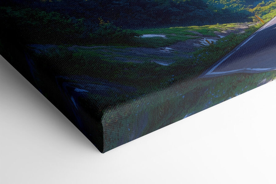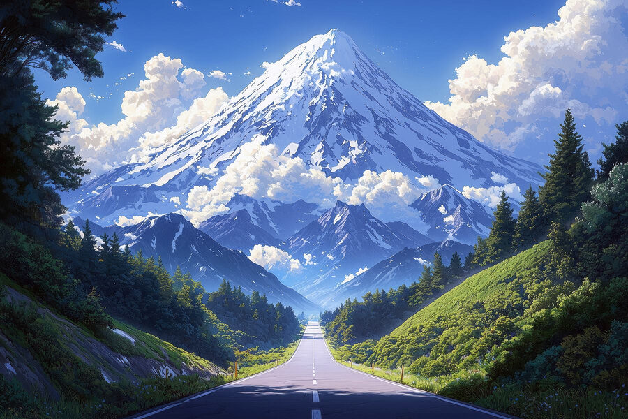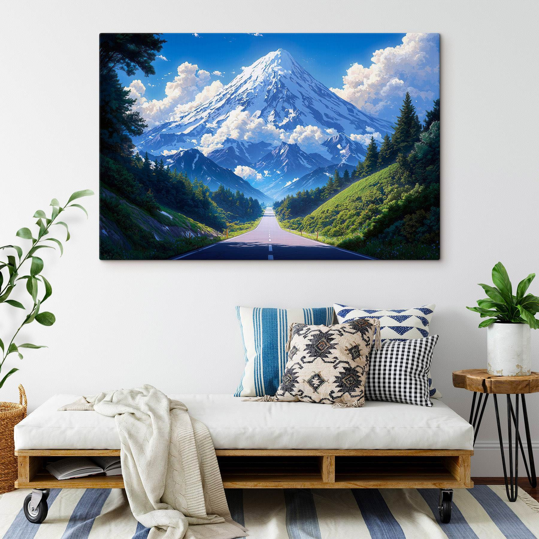 Stel je een gezellig hoekje in je huis voor dat getransformeerd is door deze prachtige canvasprint. Een serene weg baant zich een weg naar een majestueuze berg en nodigt de verbeelding uit om een kleine reis te maken. Het is als de perfecte dagdroom, waarbij elke blik je meeneemt naar frisse lucht en adembenemende uitzichten. Het levendige groen van het bos contrasteert prachtig met het koele blauw van de lucht en de besneeuwde bergtoppen. Het is een vleugje natuur dat een vredige sfeer brengt in elke ruimte. Of het nu je woonkamer is of een rustige werkplek, dit stuk zal een vleugje reislust opwekken en iedereen eraan herinneren dat avontuur om de hoek ligt – je hebt geen wandelschoenen nodig. Leun achterover, glimlach en laat het uitzicht je meevoeren!