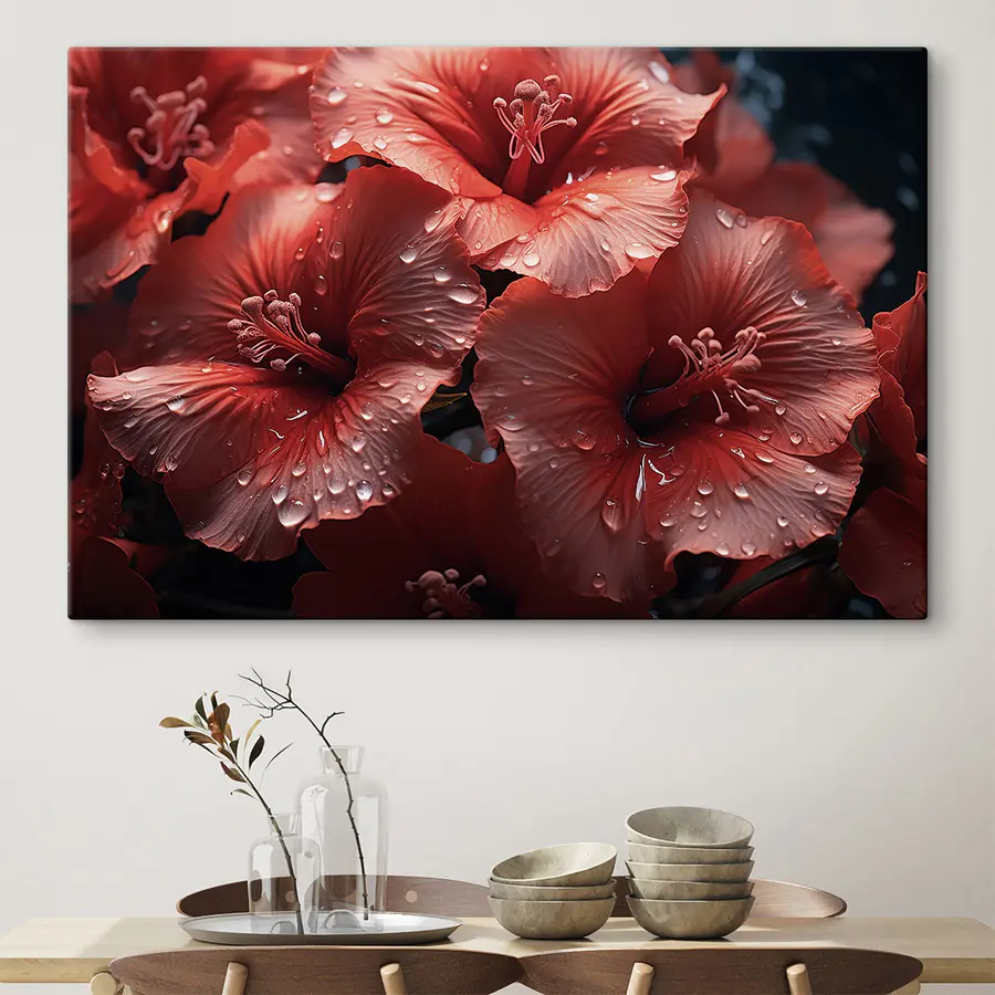 Fleur elke kamer op met deze prachtige canvasprint met een levendige groep rode bloemen. Het is alsof je een vleugje natuur in huis haalt, zonder dat je water hoeft te geven! Stel je voor dat dit prachtige stuk in een gezellige woonkamer of misschien boven een eettafel hangt en moeiteloos een warme en uitnodigende sfeer creëert. Elk bloemblaadje lijkt een zoet geheim te fluisteren, terwijl de zachte waterdruppels een verfrissend tintje geven. Perfect voor natuurliefhebbers of iedereen die hunkert naar een beetje bloemenflair in hun ruimte. Het zal zeker vreugde opwekken en misschien zelfs een nostalgische dagdroom over een zonovergoten tuin.