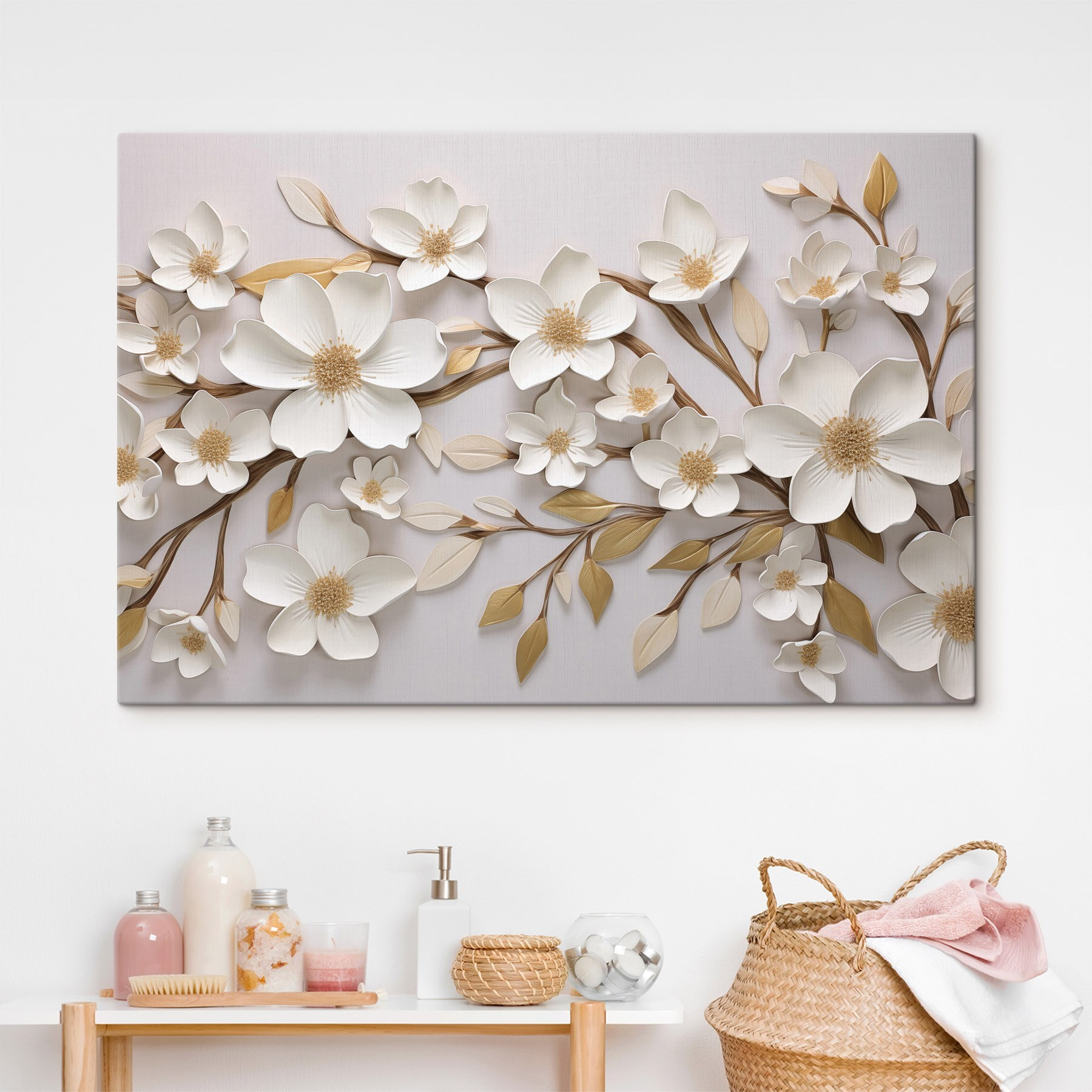 Transformeer elke kamer met deze prachtige bloemenprint op canvas. Het is alsof je een beetje natuur in huis haalt, zonder de pollenallergie. Stel je voor dat je elke dag wakker wordt met deze elegante bloemen – over een sfeermaker gesproken! De zachte kleuren en het artistieke arrangement voegen een vleugje verfijning toe zonder te stoffig te zijn. Of het nu in de woonkamer, slaapkamer of zelfs een gezellig hoekje staat, het voelt als een tuin die nooit verwelkt. Perfect om in weg te dromen of gewoon even te genieten met een warme kop koffie. Dit stuk is niet alleen decor; het is een stukje vreugde voor je muren.