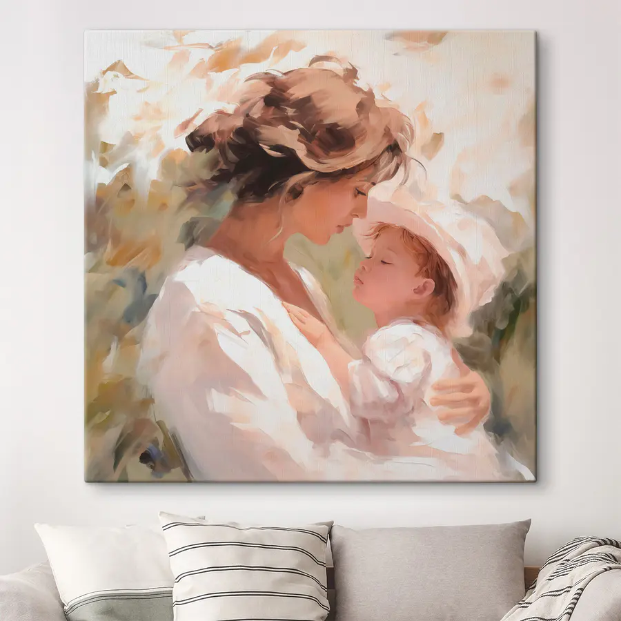 Stel je voor dat je een gezellige ruimte binnenloopt en begroet wordt door dit prachtige canvas van een vrouw die haar kleintje vasthoudt. Het is als een warme knuffel die je meteen doet glimlachen. De zachte kleuren en zachte uitdrukkingen leggen een moment vol liefde en tederheid vast. Perfect voor een kinderkamer of een woonkamer, het vertelt een verhaal zonder een woord te zeggen. Je kunt bijna het ritme van een langzaam kloppend hart voelen, de zachtheid van de omhelzing van een moeder. Het is niet alleen kunst; het brengt een vleugje warmte die je dag opvrolijkt. Echt, wie wil zo’n sfeer niet in huis?
