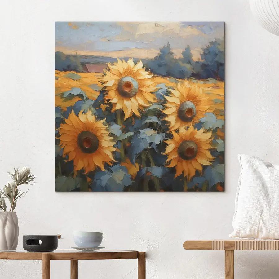 Fleur elke ruimte op met deze levendige canvasprint van zonnebloemen die dansen in een gouden veld. Het is als een uitbarsting van zonneschijn op je muur, perfect om je huis te vullen met warmte en vrolijkheid. Stel je dit eens voor: een gezellige ochtend, koffie in de hand, ogen die afdwalen naar de vrolijke bloemen die je eraan herinneren dat schoonheid overal is. Die zonnebloemen lijken meteen terug te glimlachen, waardoor elke dag een beetje vrolijker aanvoelt. Of het nu voor een woonkamer of een vrolijk hoekje is, dit object nodigt uit tot gezelligheid en een beetje natuur binnenshuis – water geven is niet nodig.