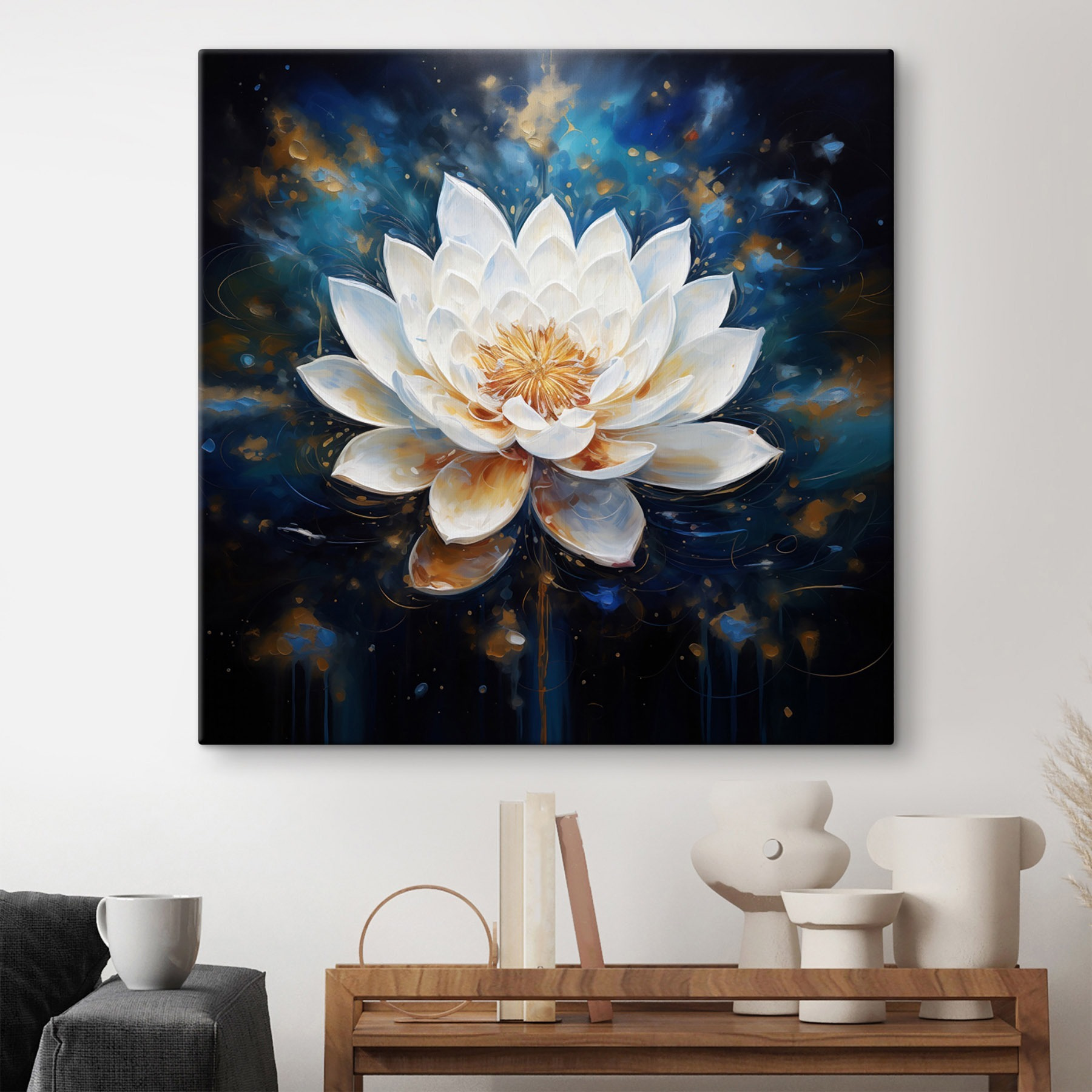 Transformeer elke ruimte met deze betoverende canvasprint, “Delicate Petals in Calming Waters”. Stel je voor dat je in een serene oase stapt telkens als je er een blik op werpt. De zachte bloemblaadjes en rustgevende blauwtinten nodigen uit tot een gevoel van vrede, waardoor het perfect is voor een gezellige leeshoek of zelfs boven een dromerig bed. Het is net alsof je een beetje natuur in huis haalt zonder dat je water hoeft te geven. Hang het op en zie hoe het meteen de stemming opvrolijkt en gesprekken over tuinen en zonnige dagen losmaakt. Dit sieraad decoreert niet alleen, het fluistert warmte en rust in je huis. Het is een vleugje magie voor je muren!