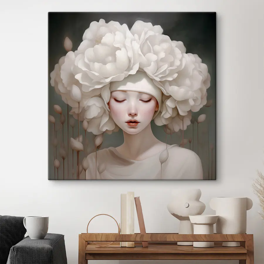 Transformeer je ruimte met deze betoverende canvasprint met een serene vrouw versierd met prachtige witte bloemen. Het is niet zomaar een decoratie; het is een uitnodiging om even stil te staan en adem te halen. Stel je het zachte gefluister van de natuur voor, gevangen in elk bloemblaadje, moeiteloos versmeltend met je knusse hoekje. Dit stuk belooft een vleugje rust en charme toe te voegen, waardoor het een perfecte metgezel is voor een rustig leeshoekje of een levendige woonkamer. Vrienden zullen misschien even stoppen en het bewonderen, zich afvragend of je een geheime vriend-kunstenaar hebt. Hang het op en zie hoe de magie zich ontvouwt!