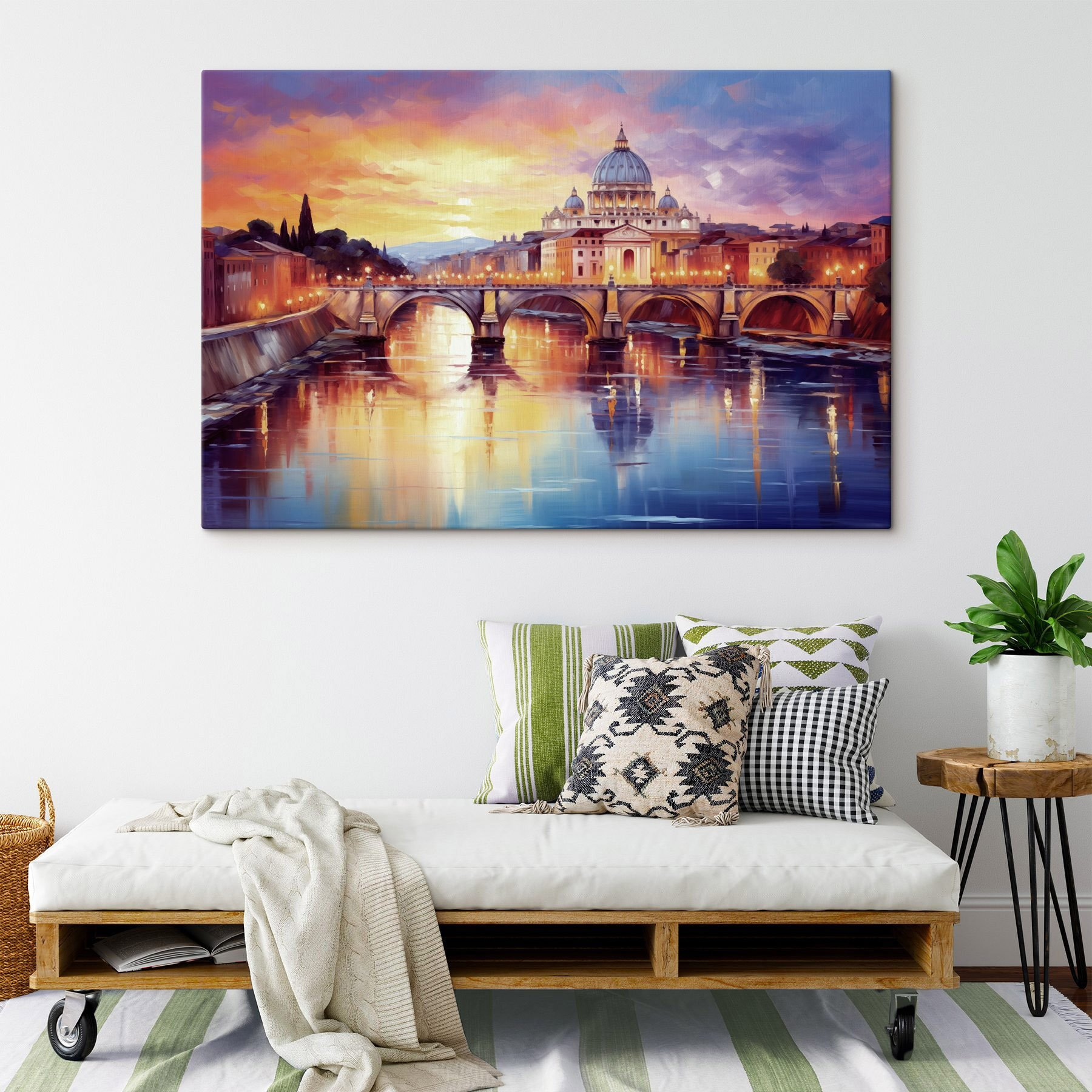 Stel je een rustige avond aan de rivier voor met deze prachtige canvasprint die warmte en charme in elke ruimte brengt. Een brug overspant sierlijk het water en weerspiegelt de tinten van de zonsondergang, terwijl een majestueus gebouw op de achtergrond de wacht houdt. Het is alsof je een stukje magie van je reis in huis haalt. Dit kunstwerk is perfect voor gezellige hoekjes of die lege muur die om aandacht smeekt en fluistert verhalen van zowel avonturen als rustige momenten. Vrienden zullen misschien wat langer in gedachten verzonken blijven terwijl ze het prachtige tafereel in zich opnemen. Wie wil er nu niet een dagelijkse dosis dromerig escapisme?