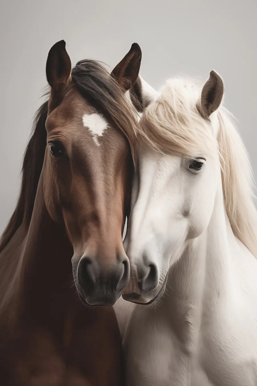 Transformeer je ruimte met deze betoverende canvasprint van twee paarden die tegen elkaar aan leunen. Dit kunstwerk legt een lief, teder moment vast, alsof ze een geheim delen. Stel je voor dat je de kamer binnenloopt en meteen die gezellige, hartverwarmende sfeer voelt, alsof je net op een charmant weidelandschap bent gestuit. Elk paard vertelt zijn eigen verhaal en creëert een band die de ziel beroert. Het is perfect voor elke plek, of het nu boven een gezellige bank is of in een serene leeshoek. Een vleugje schoonheid uit de natuur kan je dag opfleuren, vind je niet? Hang hem op en laat de magie binnen!