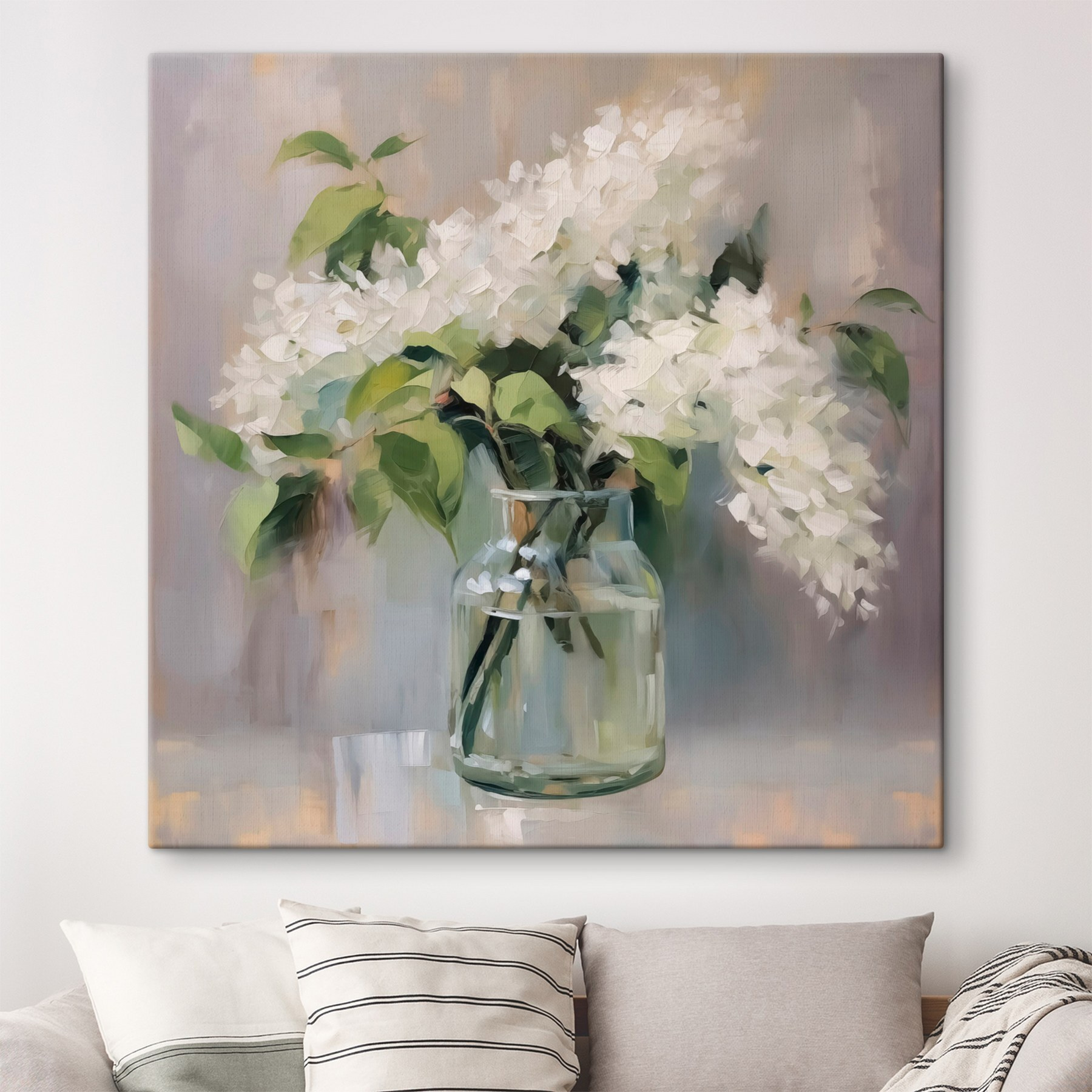 Stel je een gezellig hoekje in je huis voor waar deze mooie canvasprint de boel kan opfleuren. Met een boeket witte bloemen in een eenvoudige glazen pot is het een perfecte mix van fris en rustgevend. Stel je voor dat dit aan de muur hangt – een echte charme! Het straalt elegantie uit zonder al te veel moeite te doen, zoiets als de vriendin die er altijd verzorgd uitziet maar het moeiteloos voor elkaar krijgt. Dit bloemstuk voegt niet alleen decoratie toe, het brengt warmte in elke ruimte. Voel de rust terwijl je aan je koffie nipt en naar die vredige bloemen kijkt. Wie wil die sfeer nou niet?