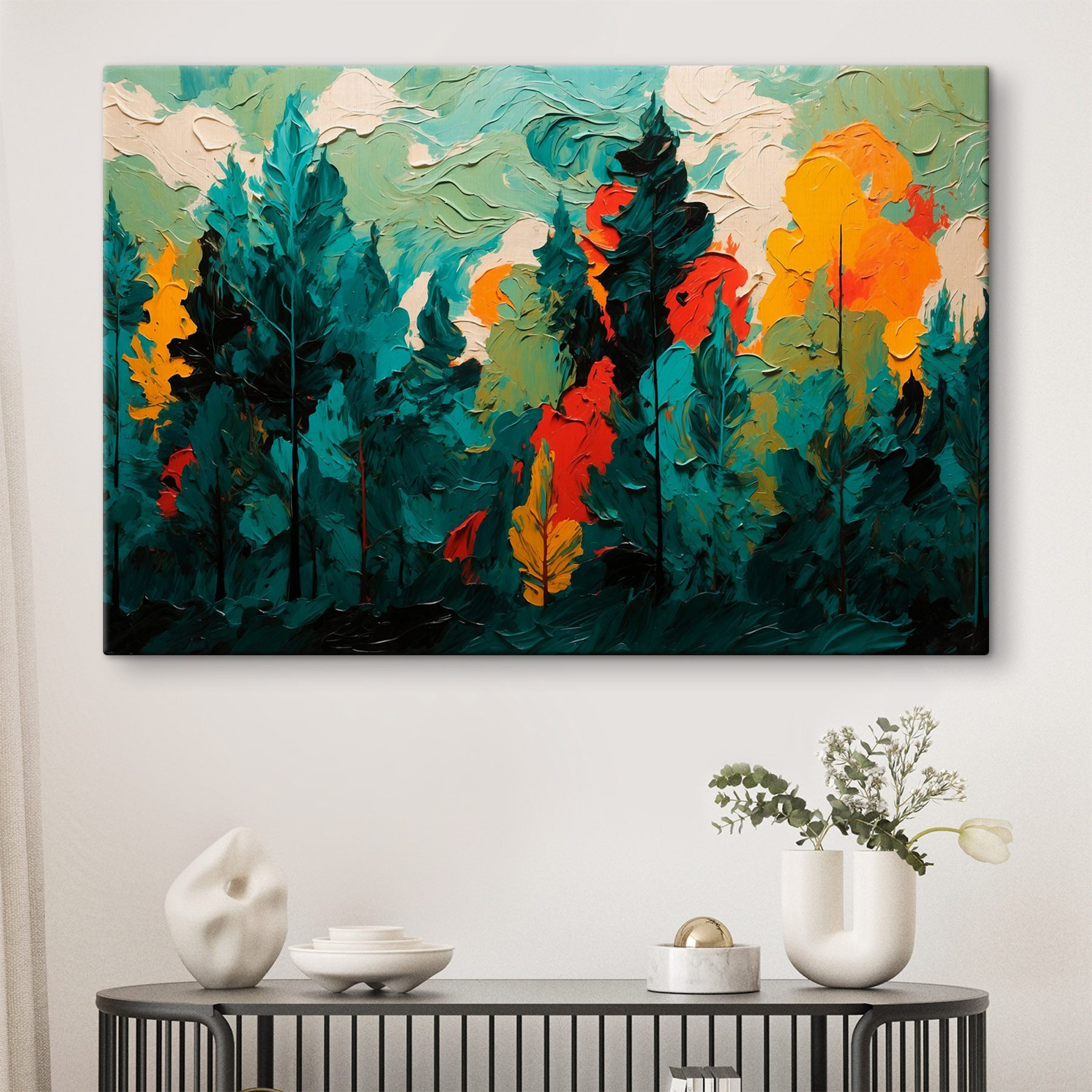 Transformeer je kamer met deze fascinerende canvasprint met een levendig schilderij van bomen die baden in het zonlicht. Stel je voor dat je een kamer binnenloopt en bam-je wordt begroet door deze uitbarsting van kleur! De rijke groentinten vermengd met vurige sinaasappels en gelen brengen de schoonheid van de natuur binnen, waardoor elke dag aanvoelt als een wandeling door een zonovergoten bos. Perfect voor gezellige hoekjes of die muur die aandacht nodig heeft, het fluistert sereniteit terwijl het een vleugje artistieke flair toevoegt. Eerlijk gezegd, wie zou zich niet een beetje lichter voelen door er alleen maar naar te kijken? Ideaal voor natuurliefhebbers en iedereen die een beetje vreugde in zijn interieur wil brengen!