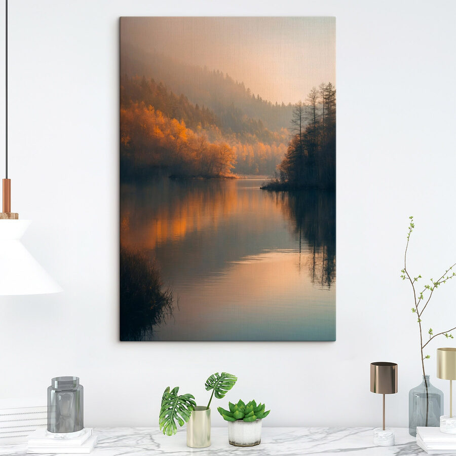 Stel je dit eens voor: een sereen meer, omlijst door fluisterende bomen en majestueuze bergen, alsof de natuur speciaal voor jou een meesterwerk heeft geschilderd. Deze canvasprint hangt niet zomaar aan de muur, maar nodigt je uit om diep adem te halen en de rust over je heen te voelen komen. Een warme gloed van de zonsondergang danst over het water, waardoor het moeilijk is om niet te dagdromen over luie middagen aan de oever van de rivier. Perfect voor een gezellig hoekje of een woonkamer die hunkert naar een vleugje van het buitenleven. Het is alsof je een stukje rust in huis haalt. Wie zou dat niet willen?