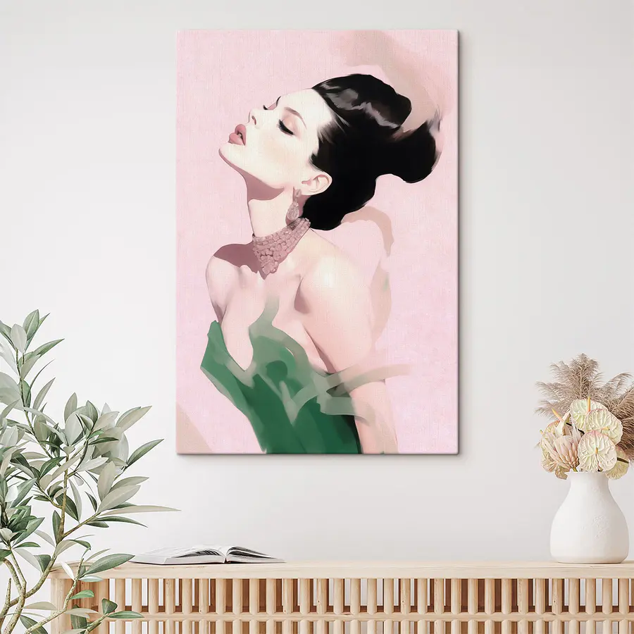 Stap in een wereld van chique elegantie met deze prachtige canvasprint, met een vrouw die zelfvertrouwen uitstraalt met haar stijlvolle kapsel. Het is alsof ze klaar is voor haar volgende grote avontuur – misschien een avondje uit of een onverwachte ontmoeting. Geplaatst in een gezellige hoek van een kamer, lokt dit kunstwerk onmiddellijk gesprekken uit en voegt het een vleugje persoonlijkheid toe aan elke ruimte. De zachtroze achtergrond vult de levendige outfit prachtig aan en creëert een rustgevende maar toch speelse sfeer. Stel je voor dat je een bijeenkomst organiseert en dat je gasten zich vergapen aan dit kunstwerk, waardoor een ontspannen sfeer vol creativiteit ontstaat. Het is het soort kunst dat niet alleen aan de muur hangt, maar de ruimte tot leven brengt!
