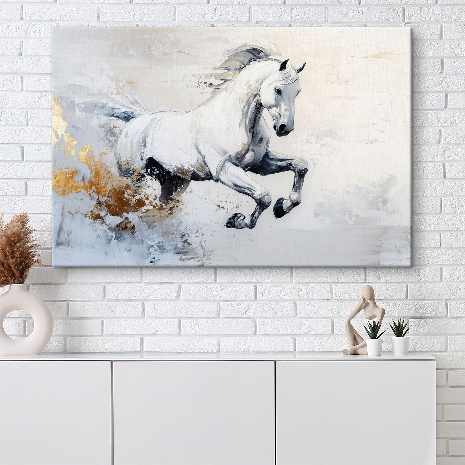 Stel je voor: een prachtig wit paard, gevangen midden in de galop, barstensvol leven en energie. Deze canvasprint is niet alleen decor; het is als een frisse wind in je interieur. Stel je voor dat je hem op een plek hangt waar je hem elke dag kunt zien, bijvoorbeeld in de woonkamer of een gezellig leeshoekje. De manier waarop de kleuren samen dansen trekt de aandacht, waardoor zelfs de saaiste dagen helderder aanvoelen. Het is ook een gespreksstarter! Wie wil er nu niet praten over die krachtige geest? Voeg een beetje flair en persoonlijkheid toe en laat dit paard deel uitmaken van de familie.