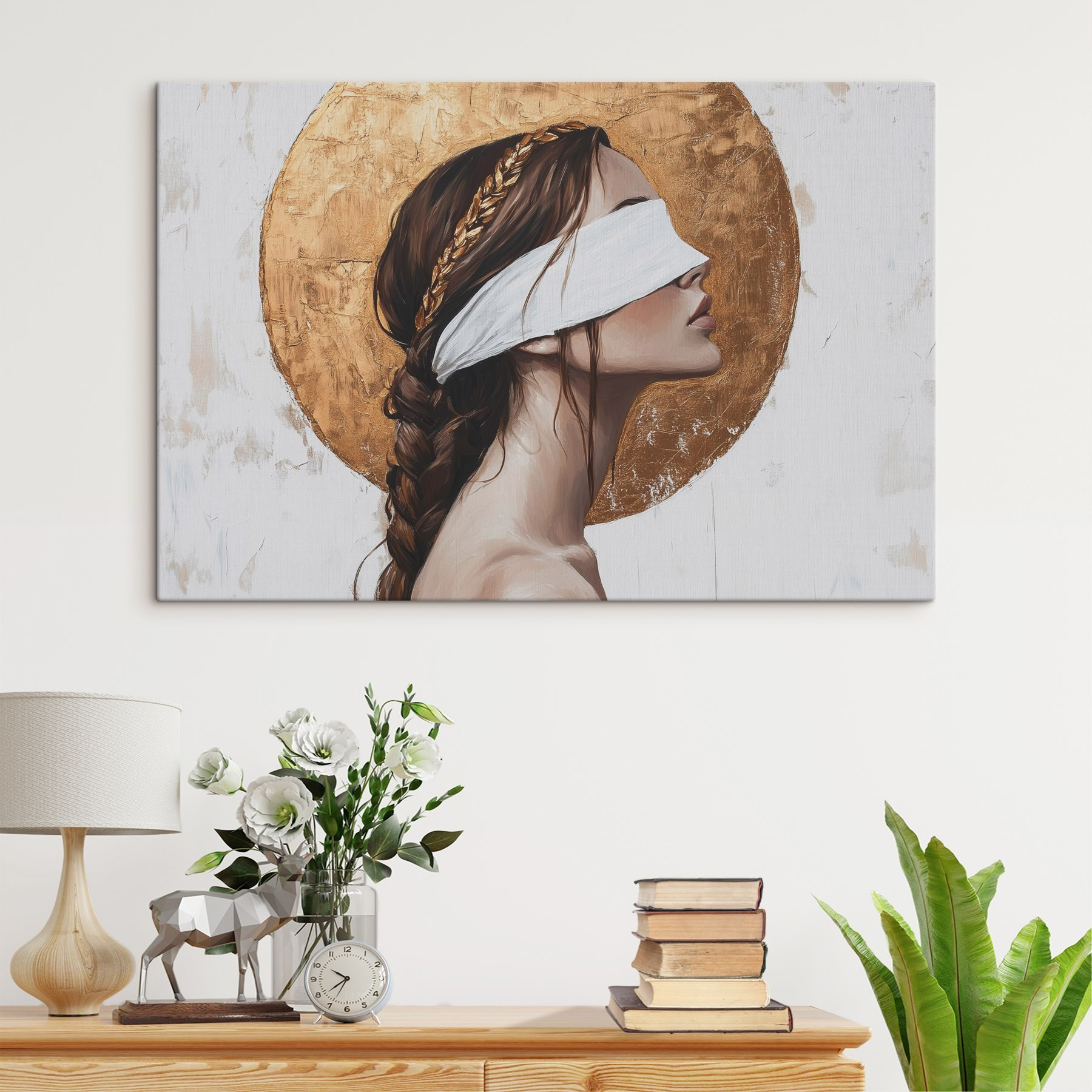 Op deze fascinerende canvasprint staat een vrouw met een blinddoek voor, die een mysterieuze en gracieuze sfeer uitstraalt. De zachte tinten en zachte lijnen nodigen je uit om na te denken over haar verhaal – wat zit er achter die gesloten ogen? Als je dit kunstwerk in je kamer plaatst, kan het de sfeer compleet veranderen en een gespreksonderwerp worden voor vrienden en familie. Stel je voor dat het een gezellige leeshoek opfleurt of gesprekken op gang brengt in een levendige woonkamer. Het is de perfecte mix van elegantie en raadselachtigheid, een mooie herinnering dat soms de magie in het mysterie schuilt!